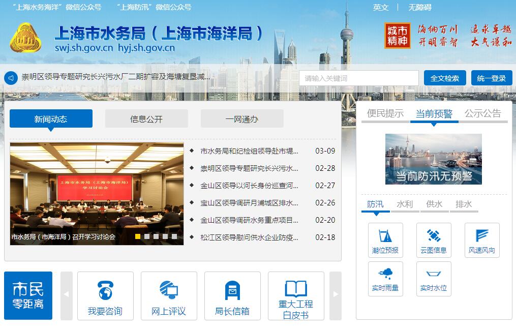 上海市水务局,为市政府组成部门。上海市海洋局与上海市水务局合署办公。其主要职责是:(一)贯彻执行有关水务、海洋管理的法律、法规、规章和方针、政策;研究起草有关水务、海洋管理的地方性法规、规章草案和政策,并组织实施有关地方性法规、规章和政策。(二)根据本市国民经济和社会发展的总体规划,负责编制本市水务、海洋专业规划、中长期发展规划和年度计划,并组织实施;会同有关部门制定本市水功能区划、海洋功能区划;参与制定流域防洪、水资源和海区海洋经济、资源、环境等规划。(三)负责本市水资源(地表水、地下水)的统一管理和保护;负责制定水资源中长期供求计划、水量分配和调度方案并监督实施;组织实施取水许可制度、排水许可制度和水资源费征收工作;核定水域纳污能力,提出限制排污总量建议;负责计划用水、节约用水工作。(四)会同市有关部门管理滩涂资源,组织编制滩涂开发利用和保护规划、年度计划并监督实施;负责本市长江河道的采砂管理。(五)主管防汛抗旱工作,承担市防汛指挥部日常工作。(六)主管本市水文工作,组织实施水文水资源监测、水文站网建设和管理,发布水文水资源信息、水文情报预报和水资源公报。(七)负责水利、供水、排水行业的管理,并承担相应的监管责任;研究提出有关水务的价格、财务等经济调节意见,参与对水务、海洋管理资金使用的管理。(八)主管本市河道、湖泊、江海堤防,负责本市水务工程建设和管理;组织、指导和监督水务工程设施的建设和运行管理;负责本市水务建设工程质量和安全监督管理;负责实施具有控制性或跨区域的重要水利工程的建设和运行管理。(九)负责农村水利工程,组织、指导农田水利基本建设,会同市有关部门组织实施水土保持工作。(十)负责本市海域海岛的监督管理;审核海域使用申请,实施海域权属管理和海域有偿使用制度;负责海底电缆、管道审批和监督管理;负责本市海域勘界、海洋基础数据管理;负责综合协调海洋事务。(十一)承担保护海洋环境的责任,组织海洋环境调查、监测、监视和评价;会同有关部门制定地方海洋环境保护与整治规划、标准、规范,执行国家确定的污染物排海标准和总量控制制度;负责防治海洋工程项目和海洋倾废对海洋污染损害的环境保护工作;核准海洋工程环境影响报告书;监督管理海洋自然保护区,负责海洋生态环境保护;负责海洋环境观测预报和海洋灾害预报警报。(十二)依法实施水行政执法和海洋行政执法,查处违法行为;协调部门间和区县间的水事纠纷,负责协调水务、海洋突发事件的应急处理;监督管理涉外海洋科学调查研究、海洋设施建造、海底工程和其他海洋开发活动。(十三)研究制定水务和海洋发展的重大技术进步措施,组织海洋基础与综合调查和水务、海洋重大技术攻关;组织实施国家有关水务、海洋技术质量标准和规程、规范,承担地方标准的起草。(十四)承担有关行政复议受理和行政诉讼应诉工作。(十五)承办市政府交办的其他事项。
