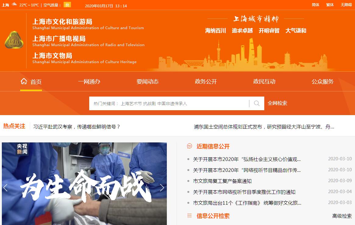 上海市文化和旅游局是主管本市文化、旅游、广播电视和文物工作的市政府组成部门,为正局级,加挂上海市广播电视局、上海市文物局牌子。上海市文化和旅游局的主要职责是:(一)贯彻执行有关文化和旅游、广播电视、文物的法律、法规、规章和方针、政策。研究起草文化和旅游、广播电视、文物方面的地方性法规、规章草案,拟订相关政策,并组织实施。(二)拟订文化和旅游、广播电视事业和产业以及文物行业发展规划和相关地方标准,并组织实施。参与拟订旅游跨区域规划。推进文化和旅游与科技、教育、金融、交通、工业等融合发展。(三)拟订重大文化和旅游活动中长期规划。管理全市性重大文化和旅游活动,指导重点文化和旅游设施建设、产业园区建设和区域性特色产业群建设。组织上海旅游整体形象推广,制定市场推广和开发战略,指导重要旅游产品开发和推广工作,拟订红色旅游等专项规划。(四)指导、管理本市文艺事业。指导艺术创作生产,扶持体现社会主义核心价值观、具有导向性代表性示范性的文艺作品,推动各门类艺术、各艺术品种发展。(五)负责本市文化和旅游、广播电视公共服务,组织开展文化和旅游、广播电视公共服务的体系建设,深入实施文化惠民工程,推进本市基本公共文化服务标准化、均等化。负责本市公共文化事业发展。指导和组织开展各类群众性文化活动。(六)指导和组织实施本市文化和旅游、广播电视、文物科技创新发展,负责行业信息化、标准化建设,发布行业数据。(七)负责非物质文化遗产保护,推动非物质文化遗产的保护、传承、普及、弘扬和振兴。(八)指导文化和旅游、广播电视产业发展。促进文化和旅游产业与相关产业融合发展。组织实施本市文化和旅游资源的普查、挖掘、保护和开发利用。(九)负责培育和发展文化和旅游市场,对文化和旅游市场进行行业监管,推进行业信用体系建设,依法规范文化和旅游市场。负责组织和指导、管理文化市场综合执法,协调相关部门处置行业突发应急事件。(十)负责对各类广播电视机构进行业务指导和行业监管。会同有关部门,对网络视听节目服务机构进行管理。实施广播电视节目评价工作,指导本市电视剧行业发展和电视剧创作生产。监督管理、审查广播电视节目、网络视听节目的内容和质量,指导、监管广播电视广告播放。(十一)监督管理本市广播电视频率、频道资源以及有线网络规划和建设,组织实施广播电视科技重大项目建设,保障本市广播电视网络传播传输安全。推进广播电视与新媒体技术新业态融合发展,推进广电网与电信网、互联网三网融合。(十二)负责本市文物保护、管理和利用工作。组织协调考古发掘和出土文物抢救工作,指导协调博物馆开展业务和学术交流活动以及博物馆间的交流、协作与资源共享。(十三)指导、管理文化和旅游、广播电视、文物对外及对港澳台的交流工作,管理驻沪外交机构和国际组织举办的文化和旅游、广播电视、文物等活动。(十四)拟订文化和旅游、广播电视、文物行业人才队伍建设规划并组织实施。指导、监督市级文化和旅游、广播电视、文物行业社会组织开展工作。(十五)完成市委、市政府交办的其他任务。