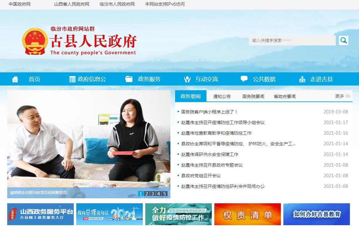 | 网站简介: 古县是山西省临汾市的下辖县,位于临汾市东北部,太岳山南麓,汾河、涧河中上游,东与安泽毗邻,西与洪洞接壤,南与尧都、浮山相参,北与霍州、沁源交界。古县全县辖4镇3乡,6个社区73个村,总面积1206平方公里,常住人口9.6万人。古县是蔺相如的故里,有三合牡丹景区等著名景点和热留关帝庙省级重点文物保护单位。古县县城获评2018年国家卫生县城(乡镇)。2019年全县地区生产总值完成49.9亿元,同比增长5%;社会消费品零售总额完成12.3亿元,同比增长7.7%;城乡居民人均可支配收入分别完成34036元、11951元,同比分别增长6.7%、12.2%;规模以上工业增加值完成30.87亿元,同比增长1.5%;固定资产投资完成11.1亿元,同比增长9.3%;在落实减税降费近1亿元的情况下,公共财政预算收入完成4.7亿元,同比增长10.4%。2020年11月,古县入选第六届全国文明城市。 |