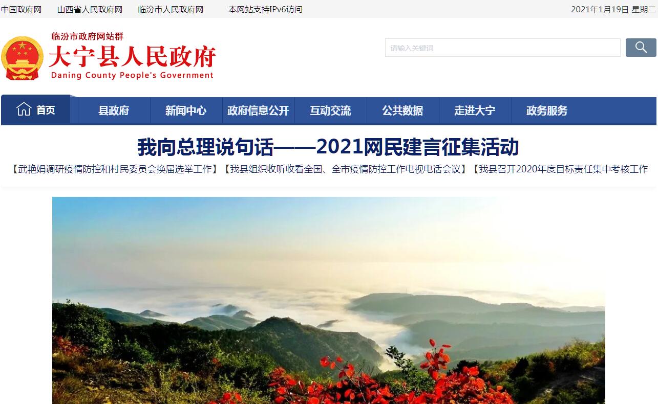 | 网站简介: 大宁县,隶属于山西省临汾市,位于山西省吕梁山南端,北与永和县接壤,南同吉县毗连,东与蒲县、隰县为邻,西与陕西延长县隔黄河相望。总面积967平方公里,辖2镇4乡60个村,总人口6.62万人。大宁县非物质文化种类,有蒲州梆子、威风锣鼓等多种民间艺术形式。2018年9月25日,获得“2018年电子商务进农村综合示范县”荣誉称号。2019年全县地区生产总值完成9.43亿元,同比增长17.1%;一般公共预算收入完成6199万元,同比增长64.3%;规模以上工业增加值同比增长57.4%;全社会固定资产投资完成17.9亿元,同比增长19%;社会消费品零售总额完成3.92亿元,同比增长7.8%;城镇居民人均可支配收入完成21375元,同比增长8.4%;农村居民人均可支配收入完成4485元,同比增长18.6%。 |