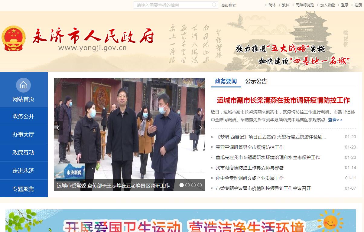 | 网站简介: 永济,是山西省辖县级市,由运城市代管,位于山西省西南部,总面积1207.99平方千米。永济市辖3个街道、7个镇,截至2017年末,永济市常住人口458920人。境内南同蒲铁路贯穿东西,过黄河与陇海线接轨,大西高铁在永济建有车站,运风高速公路贯穿全境。永济市有鹳雀楼、五老峰、普救寺等风景名胜。2018年10月22日,入选2018年全国农村一二三产业融合发展先导区创建名单。2019年,生产总值完成126.9亿元,增长2.3%;规上工业增加值完成14.2亿元;固定资产投资43.8亿元;社会消费品零售额70.4亿元,增长7.8%;财政总收入7.96亿元,增长4.6%;一般公共预算收入4.85亿元,增长6.2%;城镇居民人均可支配收入31819元,增长6.8%;农村居民人均可支配收入14742元,增长9.2%。 |