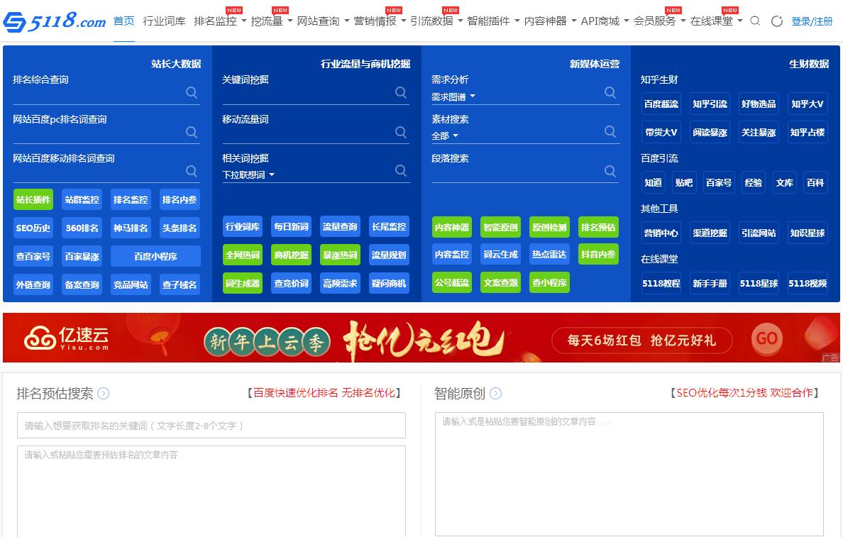 | 网站简介: 5118通过对排名各类大数据挖掘,提供关键词挖掘,行业词库,站群权重监控,关键词排名监控,指数词,流量词挖掘工具等排名工作人员必备百度站长工具平台。 |