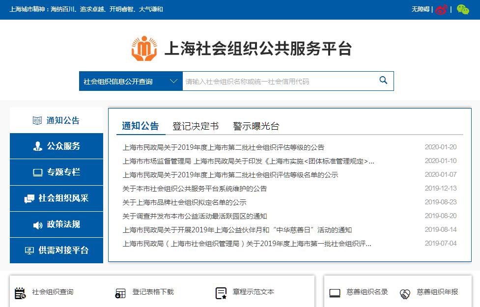 | 网站简介: 上海社会组织公共服务平台由上海市民政局(上海市社会组织管理局)主办。 |