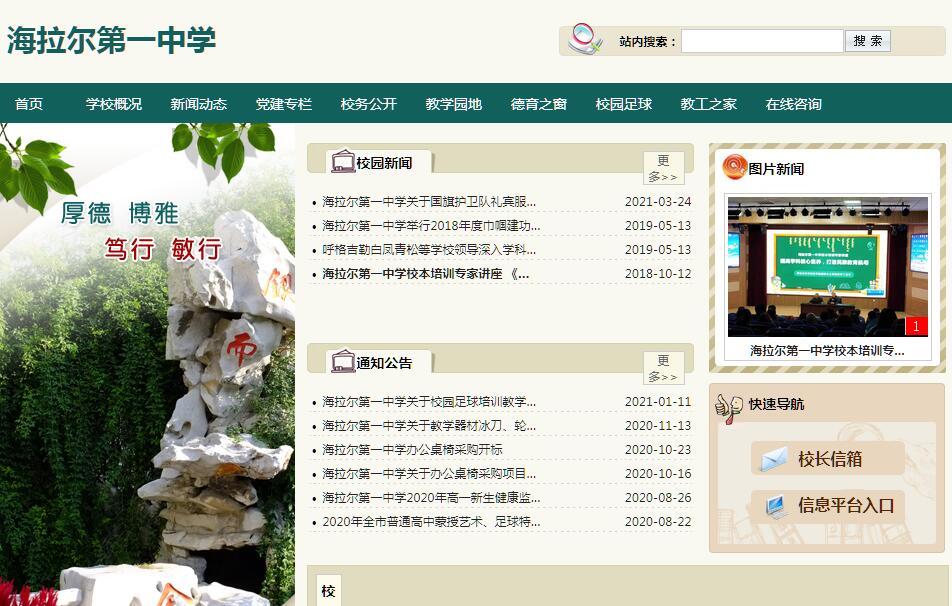 | 网站简介: 海拉尔第一中学始建于1923年5月,是内蒙古自治区重点高中,是呼伦贝尔一一所用蒙汉两种语言授课的民族高级中学。 |