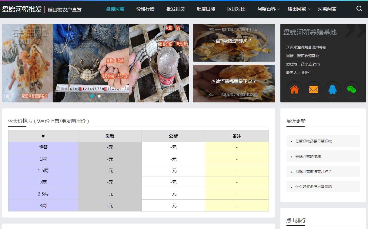 | 网站简介: 盘锦河蟹批发基地,主要经营稻田河蟹批发零售、蟹苗及盘锦周边特产等 ;专业养殖纯本地稻田螃蟹,经营多年,提供2021年河蟹一斤多少钱的批发价格等服务! |