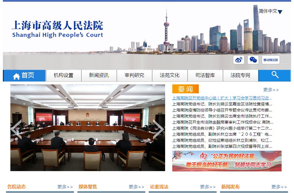 上海市高级人民法院成立于1949年,是全市最高一级审判机关,设有刑事、民事、民商、知识产权、海事海商、金融、行政审判庭,以及审判监督庭、申诉审查庭、立案庭、执行局等。此外还设有办公室、政治部、研究室、行政装备处、监察室、法警总队等综合部门。上海市高级人民法院下辖第一、第二、第三中级人民法院(知识产权法院、铁路运输中级法院),海事法院、金融法院、上海铁路运输法院等专门法院以及16个区法院。上海高级人民法院依法审理由其管辖的第一审案件;下级人民法院移送审判的第一审案件;最高人民法院依照法律规定指定审判的第一审案件;对中级法院、海事法院及知识产权法院一审判决和裁定的上诉案件;人民检察院按照审判监督程序提出的抗诉案件等。高级人民法院指导、监督下级人民法院的审判工作。上海高院紧紧围绕“让人民群众在每一个司法案件中都感受到公平正义”的目标,坚持司法为民、公正司法主线,以司法体制改革为动力,强化审判工作,服务工作大局,推进法治上海、平安上海建设,坚持从严治院,建设过硬队伍,努力为上海经济社会发展营造良好的法治环境,提供有力司法保障。上海高院着力推进司法公开,构建开放、动态、透明、便民的阳光司法机制,在审判流程、裁判文书、执行信息三大公开平台的基础上,逐步构建了12368诉讼服务平台、知识产权司法保护服务平台、律师服务平台、新闻信息公开平台等司法公开新的渠道。上海司法文明指数连续三年名列全国第一。上海法院作为全国司法体制改革试点单位之一,坚决贯彻中央、市委、最高人民法院的统一部署,坚持顶层设计、分步实施、试点先行、先易后难、依法稳妥的原则,牢牢把握改革的正确方向,准确把握改革的目标任务,有重点、有步骤、有秩序地推进改革,较好地完成了改革任务,为全国司法体制改革创造了可复制、可推广的经验。上海高院着力抓好法院队伍建设,加强廉政教育,强化审务督察;加强法官队伍正规化、专业化、职业化建设,不断提高司法能力,涌现出了一大批邹碧华式的好法官、好干部。