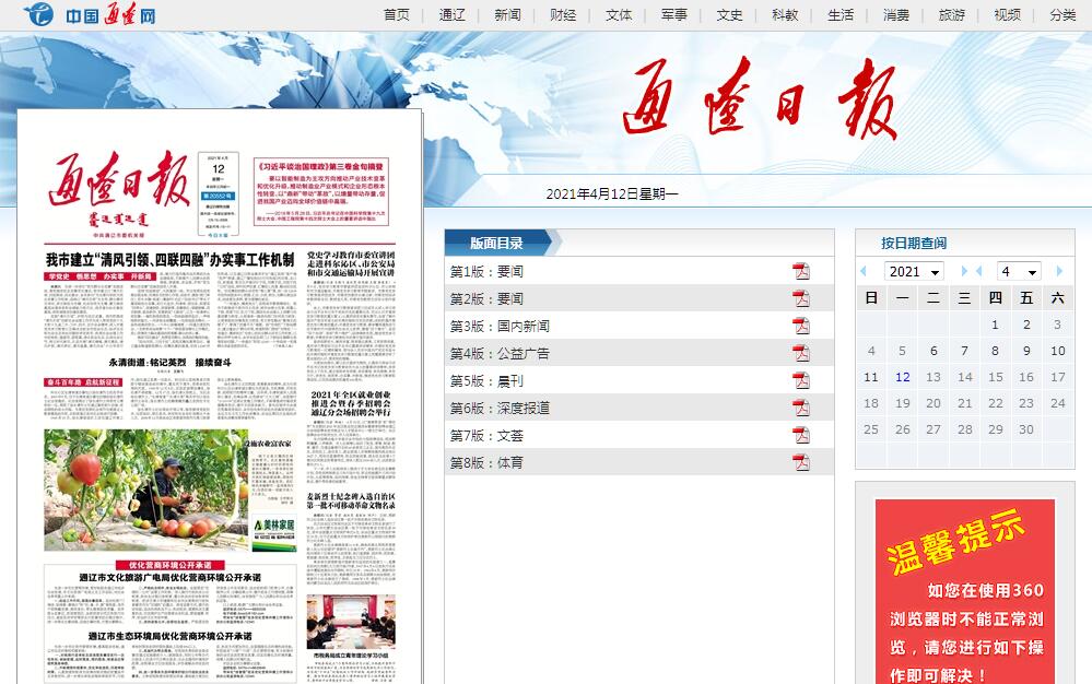 | 网站简介: 通辽日报电子版,通辽日报多媒体数字化报。《通辽日报》原名《哲里木报》,创刊于1956年9月。通辽日报用蒙汉两种文字出版发行。 |