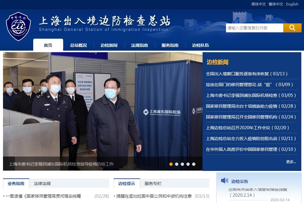 中华人民共和国上海出入境边防检查总站,简称“上海边检总站”,隶属国家移民管理局领导,人民警察编制。1952年1月4日,中华人民共和国华东军政委员会在上海组建了“上海边防检查站”,负责上海港口的边防检查工作,结束了上海“有边无防”的历史。近半个世纪的发展建设中,上海边防检查队伍历经公安部队、人民解放军、人民武装警察部队等建制。1998年7月3日,根据《国务院关于北京等九城市边防检查职业化改革试点方案的批复》(国函〔1997〕76号),上海边检由现役制转为职业制。上海出入境边防检查总站为正局级建制。总站机关设办公室、政治处、督察处、纪委办、后勤处、边检处和技术处。下辖上海机场、浦江、金山、吴淞、外高桥、上海铁路、虹桥、洋山、崇明九个出入境边防检查站(其中上海机场边检站为副局级,其余边检站为正处级),担负着上海国际机场口岸、上海港口岸以及上海铁路口岸的出入境边防检查任务。上海边检总站为维护国家主权、安全和社会秩序,履行下列职责:一是对出境、入境的人员及其行李物品、交通运输工具及其载运的货物实施边防检查;二是按照国家有关规定对出境、入境的交通运输工具进行监护;三是对口岸的限定区域进行警戒,维护出境、入境秩序;四是执行主管机关赋予的和其他法律、行政法规规定的任务。近年来,伴随着上海国际金融和航运中心建设的不断深化,受上海世博会的成功举办以及“世博效应”的辐射影响,上海经济发展迅速,出入境活动空前活跃,边检业务量逐年攀升,口岸安全形势日益严峻。上海边检总站牢记重要战略机遇期公安机关三大重要政治和社会责任,坚持“政治建警、制度管警、科技强警、从优待警”,坚持社会管理创新,把握机遇,乘势而上,不断提升边检队伍维护国家安全与政治稳定、服务经济社会发展的综合实力,高质量地完成了APEC会议、上海合作组织峰会、北京奥运会及上海世博会等一系列重大国际会议和活动的出入境边防检查任务。为保障我国重要战略机遇期社会和谐稳定,回应出入境活动对边检工作日益增长的需求,上海边检总站坚决贯彻公安部、国家移民管理局党委要求,以服务为中心,坚持顺畅通关,坚持严密管控,全力推进专业化、法治化、信息化“三大支柱”建设,树立“文明国家窗口”良好形象,为国家社会安全和上海经济发展做出积极贡献。