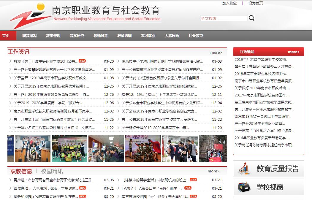 南京职业教育与社会教育网由南京市职教(成人)教研室主办。南京近代职业技术教育肇始于晚清洋务运动时期,清同治四年(1865年)两江总督李鸿章在南京聚宝门(今中华门)外创建金陵制造局,“屋宇皆仿外洋之式营造”“募洋匠为师,督诸匠制造炮位、门火……”。清光绪十五年(1889年)外国教会创办的南京斯密斯纪念医院附设医学堂是近代南京地区最早实施实业教育(职业技术教育)的学校,也是南京西医学校之始。光绪二十一年(1895年),两江总督张之洞创办的铁路专门学堂(又称矿务铁路学堂,鲁迅先生于1899-1902年曾在该学堂求学)是南京地区及江苏省内第一所官办的实业学堂。至辛亥革命前,南京地区共有6家实业学堂。民国初年,学制变更,南京地区的实业学堂改为实业学校。民国十一年(1922年),根据民国政府颁布的《壬戌学制》,南京地区实业学校改为职业学校。1949年3月,南京解放前夕,全市共有8所中等职业技术学校,在校生651人,教职工321人,另有4所高等学校附设的高级职业科。1949年4月南京解放后,市人民政府对接管的所有公私立学校进行整顿改造,并陆续建立多种类型的中等专业学校。1952年以后,为适应经济和社会发展需要,除中等专业学校外,南京地区先后创办了技工学校和农业、职业中学。至1965年底,南京地区建立工业、交通、邮电等8大类中等专业学校25所,在校学生15765人,比1949年增长24倍。十一届三中全会后,南京开始实行中等教育结构改革,通过调整、整顿,全市中等专业学校、职业中学、技工学校三类职业技术教育逐步发展,事业规模逐步扩大,形成了适应南京经济和社会发展需要的中等职业技术教育体系。进入新世纪以来,特别是“十二五”以来,南京职业教育深入推进 “双十提优工程”,加快构建“现代职教体系”,深化教育教学改革,逐步建立完善了“升学有门、就业有路、创业有方”的人才成长立交桥,全市职业教育步入发展的“黄金时期”。1.职教基础能力显著提升。全市教育系统现有职业学校27所,教职工近6000人,在校学生7万余人。27所学校中,国家中等职业教育改革发展示范校5所,江苏省高水平现代化职业学校14所、所有职校全口径跨入江苏省现代化职业学校建设行列;全市现有81个省级品牌特色专业,33个省级高水平实训基地。2.现代职教体系初步建立。构建起包括五年一贯制、5+2、3+3、3+4分段培养模式在内的现代职教体系,60%以上学生在高职以上(含本科院校)就读。3.质控评价体系渐趋成熟。构筑了以人才培养方案审批审核、统考统测、技能年段标高检测、学业水平测试、教学督导视导、全市中职人才交流会、就业质量跟踪调查反馈等为主要内容的“质量长城”。4.职教竞争能力大幅提高。南京在全省技能大赛中连续十年夺冠,在省信息化大赛中连续四年夺冠,职业教育优秀教学成果奖评选全省第一,十项办学指标南京有九项全省第一,对口单招本科录取突破600大关,跻身全省第三,毕业生就业率和就业满意率保持在98%以上。5.布局和专业供给侧改革步伐加快。深入推进《南京市职业教育学校布局调整方案》,顺利启动“441工程”,推动布局和专业供给侧改革,实现教育结构的现代化。6.名师队伍建设深入推进。“十二五”期间我室在市教育局领导下,以优秀教学团队建设为抓手,着力打造师德高尚、素质优良、技能精进的职教师资队伍,这支队伍在主要竞赛、对口单招、就业指导、品牌特色专业建设等方面都取得了突出成绩。7信息化、国际化双轮并驱,加快智慧校园建设,推进教科研手段的信息化;深化中德“双元制”“宝马售后英才教育项目”合作办学、中(南京卫校)英(国王学院)护理项目、中(南京)加(蒙特利尔)职业教育交流等国际化合作办学渠道,总结南京职业教育十种国际化模式,架设南京职校学生海外升学、就业通道,每年全市有百余名中职生跨出国门升学或就业。南京市“十三五”南京职业教育全面贯彻落实党的十八大和全国、全省职业教育工作会议精神和全市教育与学习型城市建设大会以及职业教育布局调整推进会精神,深入推进国家、省以及市中长期教育改革和发展规划纲要目标实现,以立德树人为根本、促进就业为导向,服务社会经济发展为宗旨、加大改革创新力度,加快发展现代职业教育。坚持政府推动、市场引导,坚持改革创新、先行先试,坚持产教融合、特色办学,坚持系统培养、多样成才,促进职业教育与社会需求紧密对接,教育教学改革与产业转型升级充分配套,各级各类职业教育协调发展、有机衔接,培养高素质劳动者和技术技能人才,为学生多样化选择、多路径成才搭建“立交桥”,让职业学校的每位学生都有人生出彩的机会。到2020年,建成适应“互联网+”时代的南京经济发展方式转变、产业结构调整、新兴产业壮大、“一带一路”和长江经济带建设发展需求,产教深度融合,体现终身教育理念,职业教育与普通教育相互沟通、协调发展,中等职业教育、高等职业教育、应用技术型本科教育、专业学位研究生教育紧密衔接的现代职业教育体系。