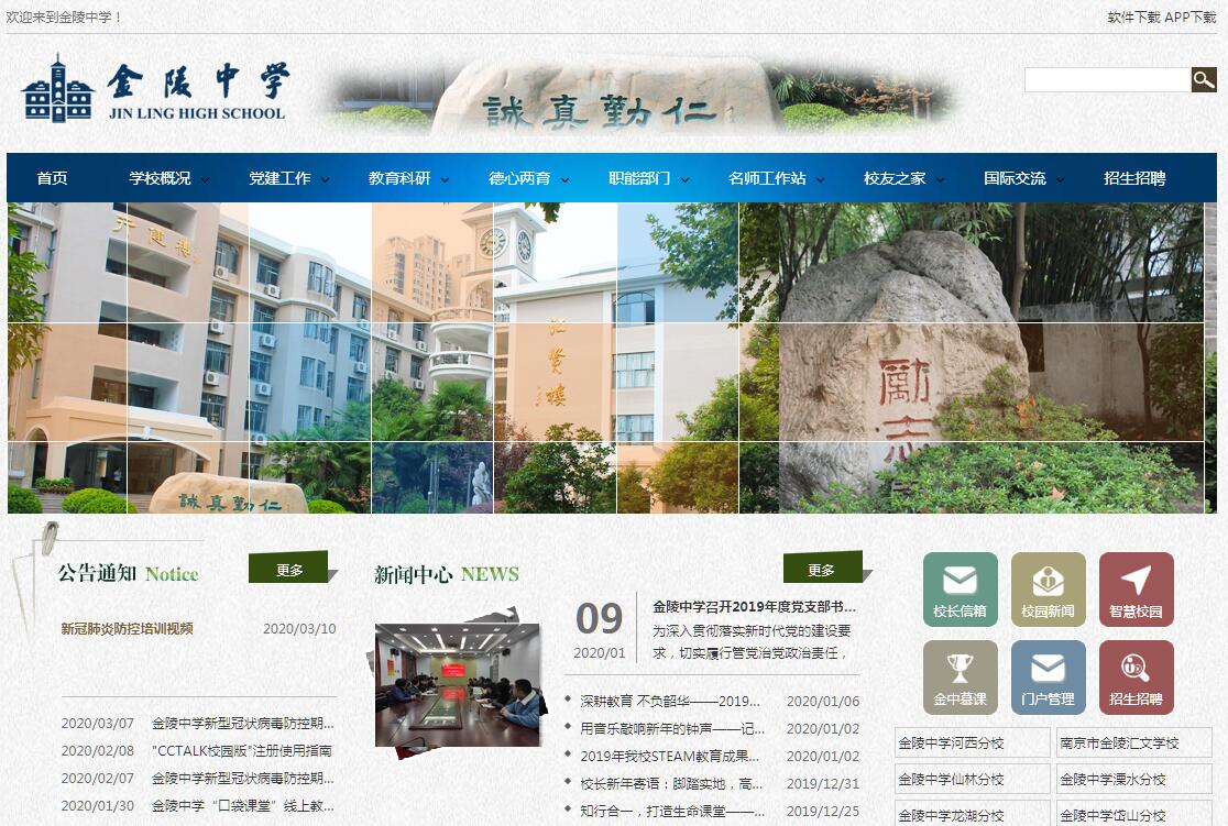 南京市金陵中学创建于1888年,历经汇文书院(1888年-1910年)、金大附中(1910年-1951年)、南京十中(1951年-1988年)时期,1988年百年校庆时更名为南京市金陵中学。学校现为江苏省首批四星级高中、江苏省首批普通高中创新拔尖人才培养试点学校、江苏省模范学校、江苏省德育先进学校、首批国家级示范高中、“宋庆龄少年儿童科技发明示范基地”、“全国科技创新教育十佳学校”、“中国青少年机器人竞赛优秀学校”、全国中小学现代教育技术实验学校、全国体育红旗学校、全国群众体育先进集体。学校现有特级教师13人、教授级高级教师9人、享受国务院特殊津贴1人、省人民教育家培养对象1人、省“333工程”培养对象16人,市级学科带头人30人,南京市优秀青年教师36人。同时,还外聘在宁教授、博导、院士担任兼职教师。一百多年来,学校培养了近6万名毕业生,其中有人民教育家陶行知,中国科学院原名誉主席、杰出的工程物理学家吴仲华,美学大师宗白华,著名经济学家厉以宁、吴敬琏,文史学家程千帆,建筑大师齐康,诺贝尔文学奖获得者高行健,中科院院士、北大副校长田刚,2016年度世界杰出女科学家鲍哲南等一批科技精英与人文大师。校友中目前获知的两院院士有26位。近几年来,学校陆续涌现一批优秀毕业生,如复旦“十大毕业生之星”王晨、李睿霖,中科大“郭沫若奖学金”获得者毛俊骅、何泽成,被“哈斯普”三大美国名校全额奖学金保研的叶天扬等。在近130年办学历程中,学校形成了优良的教育传统与办学特色,即:人文主义与科学精神相结合,严谨治学与开拓创新相结合,推崇教师与尊重学生相结合,全面发展与个性成长相结合。作为省“首批拔尖创新人才培养试点学校”,学校先后与南京大学、东南大学联合成立“准博士培养站”和“未来卓越工程师培养基地”,积极探索创新拔尖人才的成长途径和培养模式。学校现拥有“以传感器为载体的物化课程基地”和“以积极心理学为导向的高中生生涯规划课程基地”两个省级课程基地。近年来,学校在高品质课程建设方面取得了显著成绩。2014年,学校与南京大学合作的“准博士培养站建设”项目荣获江苏省教学成果奖一等奖;2015年,学校的“研究性学习系列研究”荣获南京市、江苏省教学成果奖特等奖和全国教学成果奖二等奖(南京市唯一中学获奖);2016年,学校被评为南京市首批德育示范基地校、中小学校长(高中)培训基地校;2017年,江敏老师领衔的、根植于金中生命课堂的《基于科学本质的高中化学教学实践研究》荣获江苏省教学成果奖特等奖,2017年,孙夕礼校长主持的《对高中生生涯规划指导的路径探索》荣获江苏省教学成果奖一等奖。为促进南京市基础教育的优质均衡发展,学校先后创建了南京市金陵中学河西分校、南京市金陵汇文学校、金陵中学实验小学、金陵中学仙林分校小学部、中学部、金陵中学岱山分校、金陵中学龙湖分校、金陵中学高新分校、金陵中学溧水分校。学校秉承“诚、真、勤、仁”校训,以将学生培养为“以诚为本、唯真求是、勤勉执着、以仁为怀”的现代人为培养目标,践行“为学生一生奠基、对民族未来负责”的办学理念,恪守“让课堂充满生命的活力,让校园焕发绿色的生机,让环境放射人文的光芒”的教育主张。在传承学校百年优良办学传统基础上,孙夕礼校长倡导的“开放办学、科学管理、内涵发展、张弛有度、自由成长”的金陵中学教育生态正逐步形成。