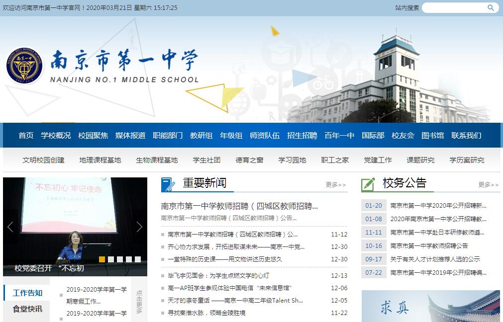 | 网站简介: 南京市第一中学溯源于光绪三十三年(1907年)创设的崇文学堂,校址为清代江宁府署箭道、西花园旧址。不久思益学校(1903年创办)并入,其后学校三易校名。1927年,李清悚先生创办首都中区实验学校,实践陶行知教育思想。1933年,学校改称南京市立第一中学。1937年抗战爆发,部分师生西迁,与苏浙皖入蜀师生联合成立国立二中。1945年,学校于原址复校,推行“真教育”。新中国成立后首任校长朱刚倡导“为祖国而教,为祖国而学”。1953年,学校被确定为14所江苏省重点中学之一。1998年,学校深化素质教育,推行“中学导师制”。2000年,学校被评为国家级示范高中、江苏省模范学校。2004年,被评为首批江苏省四星级高中。2010年,学校明确了“培养人格健全、具有创新素养的现代公民”的育人目标,积极探索创新人才的培养模式,开启国际化进程,续写新的百年华章。 |