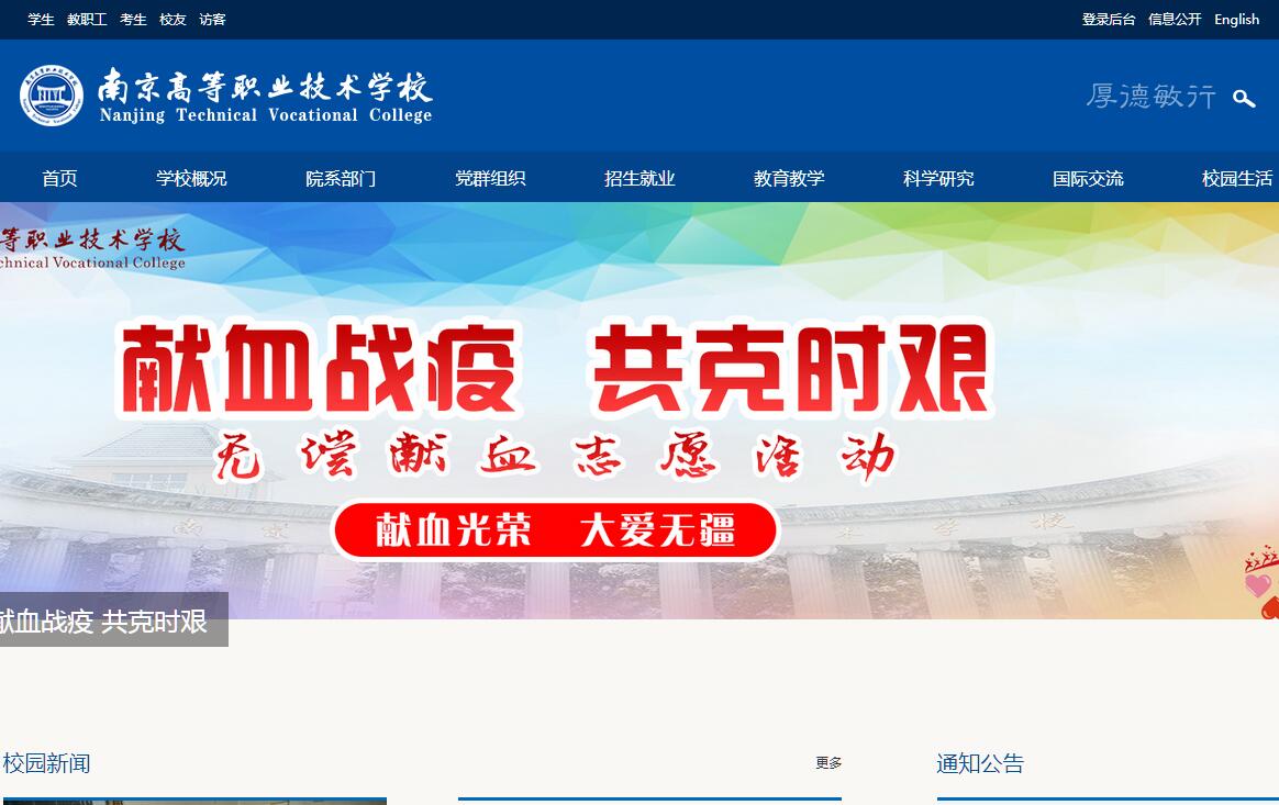 南京高等职业技术学校是一所高水平、高起点、现代化的综合性重点职业院校,是国家教育部在职教领域和德国合作的第一所项目学校,是全国中等职业教育改革发展示范校副主席单位。学校位于南京河西新城区,毗邻奥体中心,校园建筑欧陆风格,环境优美、典雅,被誉为南京新城区一道靓丽的风景线。学校占地12.5万平方米,建筑面积10.3万平方米,在校学生5100余人。学校在省内率先提出“两室两场一中心”的建设理念,共投入4000余万元,按照“高标准规划、高规格实施、高效率使用”的原则建设实践教学基地。现拥有70个设备先进的现代化实验室和28个配套齐全的校内技能实训车间,其中省级以上实训基地4个,生均设备值近2万元,位居全省同类学校前列。学校建有全国最先进的百兆宽带接入四网合一的万兆校园网,1200台计算机和130多个多媒体教室,融合有线、无线、多媒体、安防等多种应用系统。学校以五年制高职全日制学历教育为主,根据地方经济发展和市场的需求,设有土木工程系、电气工程系、环境艺术工程系、计算机管理系,共有6大类17个专业。其中,省级以上示范品牌特色专业8个,土木工程 、建筑设备安装技术、电子技术应用专业在省内外具有较高的知名度。学校是江苏省建筑类专业中心组组长单位、电子类专业建设理事长单位、江苏省职业教育体育协会会长单位。学校产教结合基地,建筑材料测试中心是江苏省一级资质企业,承担了包括南京奥体中心在内的多项国家重点工程的建材测试工作。学校拥有一支结构合理、力量雄厚、高素质的教师队伍。现有教职工286人。教师队伍中副教授、高级讲师90人。硕士以上研究生学历130人,博士8人,占专任教师53%以上,有160余人次曾赴德国接受“双元制”职业教育培训。教师队伍中有获得德国“师傅证书”的老教师,也有一大批拥有高级工程师、高级技师、国家注册的造价师、结构师、监理师、电子商务师、会计师等职业资格证书的中青年骨干教师,“双师型”教师占90%。学校有4名省职教领军人才、2人入选江苏省“333工程”人才培养计划、16名市(学院)专业(学科)带头人、3名省高校青蓝工程优秀青年教师培养对象、19名市优秀青年教师,7个市级以上优秀教学团队,成功创建了首个江苏省名师工作室。作为南京市十二五首批教育科学研究基地学校,学校教学科研成绩取得了突出成绩。“十二五”期间,学校独立承担省市级及以上教育规划课题17项,江苏联合职业技术学院课题6项,南京市个人课题13项,公开发表论文650多篇,其中发表在中文核心期刊上的文章有60多篇。参加国家和省技能大赛获得108个一等奖、97个二等奖、45个三等奖,信息化教学大赛10个一等奖、5个二等奖、9个三等奖。自2011年江苏省首次举行“两课”评比以来,学校老师共获得示范课17个,研究课6个。先后有10项国家、省市优秀教学成果奖,各项成果均领先同类学校。目前,学校是省土木水利类专业中心组组长单位、江苏联合职业技术学院应用电子技术专业协作会理事长单位,建设部职业院校楼宇智能化、建筑工程技术、建筑设备专业学习领域课程模式改革实验的牵头学校,牵头成立南京市职业教育政产学研联盟。在此背景下,学校依照“一主体两平台”的框架大力开展创业教育,“一主体”即以提升学生的创业素质于技能为主体,“两平台”即“众创空间”和“创客MALL”微网站两个平台。学校推行并内化德国“双元制”教学模式,不断进行教育教学改革,是江苏省首批课程改革实验学校。在江苏省率先引进国际通用职业资格证书考试,学生毕业考试合格,可取得德国手工业行会HWK、AHK证书和市劳动局专业技能等级证书。逐步实现学历证书与职业资格证书的“双证”融通。与博世西门子家电集团、中国电信、通力电梯以及南京地铁等多家国内外知名企业共建“订单”冠名班、共建实训实习基地。目前,学校有校外实训实习基地近200个,每个专业都有2个校内综合实训基地和至少10个校外实训实习基地,满足教师技术研究和学生实践学习的需要。多年来,学校为社会和企业输送了6万多名高素质的劳动者和高技能人才。毕业生在德国博西华、布德鲁斯、菲斯曼,瑞士吉博力,新加坡CBM公司,中建总公司、中交三航局、中兴通讯、上海大众、南京地铁等200多家国内外知名企业关键岗位上发挥着重要作用,深受广大企业青睐。每年毕业生推荐就业率100%,对口就业率95%以上。学校还在澳大利亚总工会完成“赴澳技术移民”建档注册工作,启动了赴澳技术移民工作,为学生毕业后多方位学习、就业提供发展空间。在高质量就业的同时,学校还积极构建现代职业教育体系,为学生打通学历深造的壁垒。2012年以来,共有280名五年一贯制专科毕业生通过“5+2”专转本考试,先后被金陵科技学院、南京晓庄学院录取,录取率名列全省同类学校首位。2013年,学校开始“3+4项目”的试点工作,开设电气工程技术、建筑工程施工、楼宇智能化设备安装三个专业,录取均分在615分以上,目前该项目在校学生240人。此外,学校还与中外大学联合办学(与国外新加坡CITI管理学院、韩国大田大学、德国歌德学院、法国科尔比谢学校、国内东南大学、南京工业大学、武汉理工大学等)为毕业生升入本科学习创造条件。学校还充分发挥辐射、示范、服务的功能。定期举办短训
