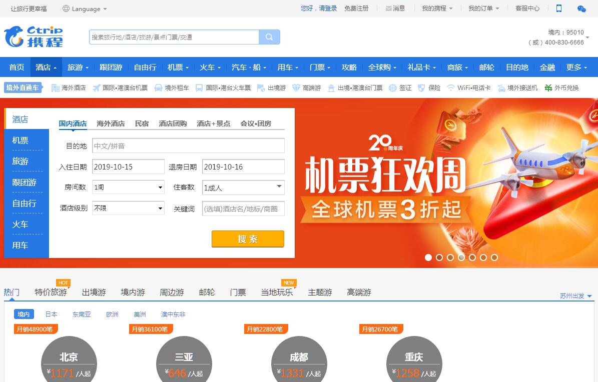 携程旅行网创立于1999年,总部设在中国上海,员工超过30000人,目前公司已在北京、广州、深圳、成都、杭州、南京、厦门、重庆、青岛、武汉、三亚、南通等95个境内城市,新加坡、首尔、香港等22个境外城市设立分支机构,在中国南通、苏格兰爱丁堡设立服务联络中心。2010年,携程旅行网战略投资台湾易游网和香港永安旅游,实现两岸三地的互通。2014年,投资途风旅行网,将触角延伸及北美洲。2015年,携程战略投资艺龙旅行网,并与百度达成股权置换交易完成对去哪儿网的控股,同年,携程首次被评为中国最大旅游集团,并跻身中国互联网企业十强。2016年1月,携程战略投资印度最大旅游企业MakeMyTrip,并在新加坡成立了东南亚区域总部。同年10月,携程加大对北美洲地区的投入,与纵横、海鸥、途风达成合作。11月,携程投资英国机票搜索平台Skyscanner(天巡),完成了对海外机票市场的布局。自此,携程完成全球化的相关业务布局。作为中国领先的综合性旅行服务公司,携程成功整合了高科技产业与传统旅行业,向超过3亿会员提供集无线应用、酒店预订、机票预订、旅游度假、商旅管理及旅游资讯在内的全方位旅行服务,被誉为互联网和传统旅游无缝结合的典范。凭借稳定的业务发展和优异的盈利能力,CTRIP于2003年12月在美国纳斯达克成功上市,上市当天创纳市3年来开盘当日涨幅最高纪录,目前市值超过230亿美元。