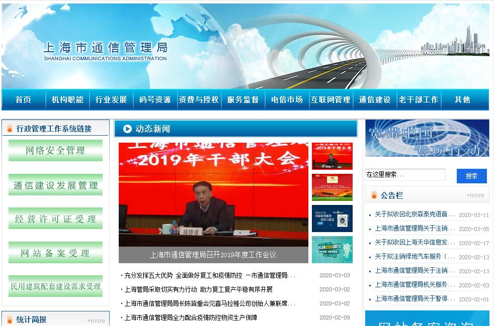 上海市通信管理局主要职责:一、贯彻执行通信行业管理政策法规,统筹规划上海市公用通信网、互联网、专用通信网并实行行业管理;监测分析上海市通信业运行态势并发布引导信息,协调解决行业运行发展中的有关问题;承担推动实施上海市“三网融合”的有关工作。二、协调上海市公用通信网、互联网、专用通信网的建设,促进资源共享;受工业和信息化部委托,负责上海市重要通信设施建设管理;监督管理上海市通信建设市场;指导上海市通信业加强安全生产管理工作。三、依法监督管理上海市电信与信息服务市场;会同有关部门监督管理电信服务资费和质量;保障普遍服务,推动行业自律;根据授权负责上海市通信网码号、互联网域名和地址等资源的管理;监督上海市公用通信网、互联网、专用通信网互联互通和公平接入。四、组织协调上海市应急通信及其他重要通信保障工作;按分工承担上海市国防通信信息动员和战备通信相关工作。五、协调管理上海市公用通信网、互联网、专用通信网网络信息安全平台;监管上海市网络运行安全;拟定上海市电信网络安全防护政策并组织实施;负责上海市网络安全应急管理和处置;受工业和信息化部委托,配合开展上海市网络环境和信息治理有关工作,配合处理网络有害信息。六、承办工业和信息化部及中共上海市委、上海市人民政府交办的其他事项。