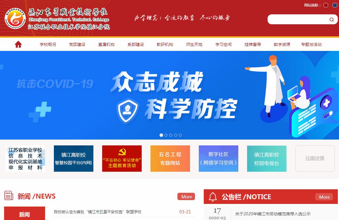 镇江高等职业技术学校(江苏联合职业技术学院镇江分院)是一所以五年制高职教育为主体的职业院校,系首批国家中等职业教育改革发展示范学校,首批省高水平现代化职业学校、省现代化示范性职业学校和省智慧校园。学校由主校区和南山校区组成,占地面积17.92万平方米,建筑面积9.78万平方米,实训基地面积3.38万平方米;在校生近5000人,教职工400余人。学校加快发展现代职业教育,坚持“合适的教育,尽心的服务”办学理念,践行“力行”校训,贯彻“服务于学生的现实发展、服务于学生的持续发展、服务于学生的幸福生活”办学宗旨,确立了“精学业、高就业、善创业”的培养目标和“自信乐观、‘智’‘能’精湛、好学儒雅、敢为人先”的学生素质发展目标,以及“科学思维能力、专业技术能力、阅读理解能力、表达沟通能力、健康生活能力和创新创业能力”等学生应备基础能力,努力培养高素质高技术高技能人才。学校拥有一支以中高级职称为主、结构合理、爱岗敬业、素质优良的卓越教师队伍。正高级讲师、副教授等以上职称教师172人,比例达41.2%。专任专业课教师共215人,比例达54.8%。研究生学历学位(含硕士在读)共208人,比例达 50.7%。现有省“333”培养对象、省职教领军人才、省青蓝工程培养对象等各级各类名师骨干100人次;省职业教育名师工作室3个、市名师工作室3个。设有机电工程系、信息工程系、旅游系、财经艺术系和基础部五大系部,现有现代制造、信息技术等五大类专业,17个五年制高职专业,5个“3+4”现代职教体系建设试点专业。已建成旅游管理等3个省现代化专业群。建成国家数控技术应用专业技能型紧缺人才培养培训基地、江苏省软件人才培养基地,电工电子等4个省高水平示范性实训基地和旅游管理等2个省现代化实训基地,以及教育部工业机器人开放式公共实训基地。固定资产总值39488.7万元,学生实习实训设备先进。2010年至2018年,我校连续九年获得江苏省职业院校技能大赛总分第一名,国赛中获得30余枚金牌。先后获得省职业院校创新大赛8个一等奖,全国发明展览会金奖,全国中等职业学校学生技能作品展洽会一等奖等。面向社会开展各级各类技能培训年均6000人次以上。近年来,学校先后获得全国职业教育先进单位、全国中等职业学校德育工作先进集体、全国职业院校技能大赛优秀组织奖、全国职业能力培训测评先进单位、全国职业院校实习管理50强、全国“文明风采”竞赛优秀组织奖、省文明校园、省职业教育与社会教育先进单位、省和谐校园、省职业院校技能大赛先进单位、省高技能人才摇篮奖、省职业教育创新大赛最佳组织学校、省中等职业学校德育工作先进集体、省中小学校先进基层党组织、省节水型学校、省园林式单位、省平安校园等荣誉称号。