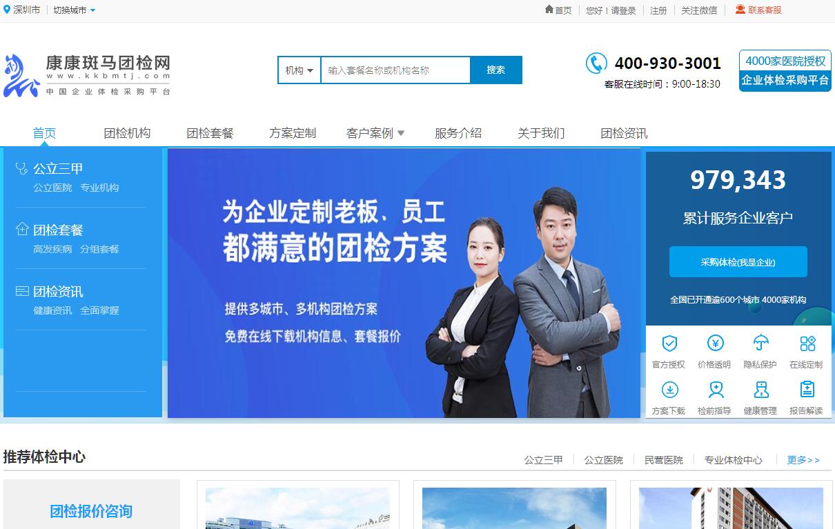 | 网站简介: 康康斑马团检网精选深圳市优质公立三甲医院与公立医院体检中心,根据企业、单位、学校,工厂的需求,提供多样化团体体检套餐定制服务预约。100%预约成功,预约可享受体检打折优惠,还有专业体检指导。康康斑马团检网专业健康服务,品质保障,为您的健康保驾护航。在康康斑马团检网预约单位员工体检,不但免费预约,还可以享受体检价格的折扣和优惠。体检后可以直接在康康斑马团检网康康斑马团检小程序或者公众号查询体检报告,第一时间了解自己的健康状况。康康斑马团检网是第三方体检预约、体检定制服务平台。 |