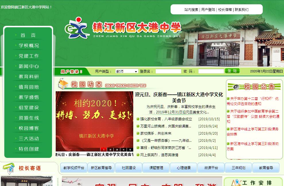 巍巍圌山脚下,滔滔扬子江畔,座落着一所焕然一新,富有办学特色的江苏省教育现代化示范初中——镇江新区大港中学北校区。整个校园既有江南园林风格的古典建筑,又有浓郁现代化气息的教学设施。典雅庄重的校门、古朴别致的亭台、设施一流的微机房、功能齐全的多媒体教室浑然一体,相得益彰,使镇江新区大港中学成为莘莘学子求学的宝地。学校占地面积70亩,建筑面积25000多平方米,现有35个班级,1500多名学生,188名教职工,149名专任教师。多年来,学校牢固确立“科研兴校”,“特色办学”,“质量立校”的宗旨,坚持以人为本,以师生共同发展为本的办学理念,坚持走素质教育之路,走教育改革之路,教育教学质量稳步提高。目前教师队伍中,市学科带头人1名,市级骨干教师8人,区级骨干教师25人。教师参加全国、省、市级各类竞赛,获奖比例逐年攀升,“做科研型教师”已成为新港中人的不懈追求,涌现出一批在镇江市范围内有一定知名度的教师。丰厚的文化积淀、浓郁的人文环境、优秀的教师群体、科学的管理模式、先进的教育理念、现代化的办学设施,使学校在近三年赢得长足的进步和良好的声誉。先后获得 “江苏省教育现代化示范初中”、“江苏省和谐教育实验基地”、“镇江市德育先进学校”、“镇江市体育传统学校”、“镇江市收费规范学校”、“三爱先进集体”、“市级巾帼示范岗”、“镇江市教育科研基地”、“镇江新区先进集体”、“江苏省体育教育工作先进学校”、“镇江市中小学生行为规范示范学校”、“江苏省青少年科技教育先进学校”等荣誉称号。展望未来,百尺竿头,更上一层,新港中将朝着“一流质量、一流师资、一流环境、一流管理、一流形象”的名校目标奋勇前进。