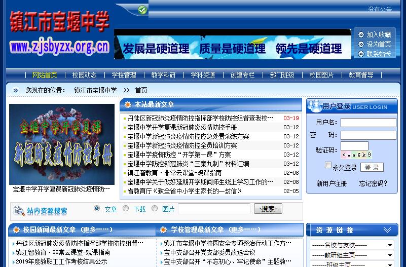 | 网站简介: 镇江市宝堰中学是一所初级中学,位于江苏省镇江市宝堰镇宝中路56号。宝中地处茅山老区,新四军四县抗敌总会所在地-宝堰镇。1948年底,一批怀着播撒文明宏愿的有识之士创办的本县第一所公办学校。解放后成为丹徒县初级中学,60年历经图治薪火相传,学校面貌日新月异,办学条件日臻完善。目前学校占地面积70亩,校舍面积15000多平方米,绿化面积20000多平方米。教学班级8个,学生300名左右,教职员工47名,专任教师40名。2001年4月学校通过省乡镇教育现代化评估验收,2003年被评为江苏省示范初中,2007年被评为镇江市信息化先进学校。近年学校抓紧机遇趁势而上,着力于校园的改造和设备的更新,着力于学校内涵的发展,着重于办学特色的彰显,紧紧围绕素质教育这一核心,不断提升现代教育理念,不断提高教育管理水平,加快教师队伍建设的进程,加深教育教学的层次,加强素质教育的推进,办学效率日益凸现,教育质量明显提高。学校先后被评为“省法制宣传教育先进集体 ”·“省德育先进学校”·“市基层创安50佳”等荣誉称号。 |