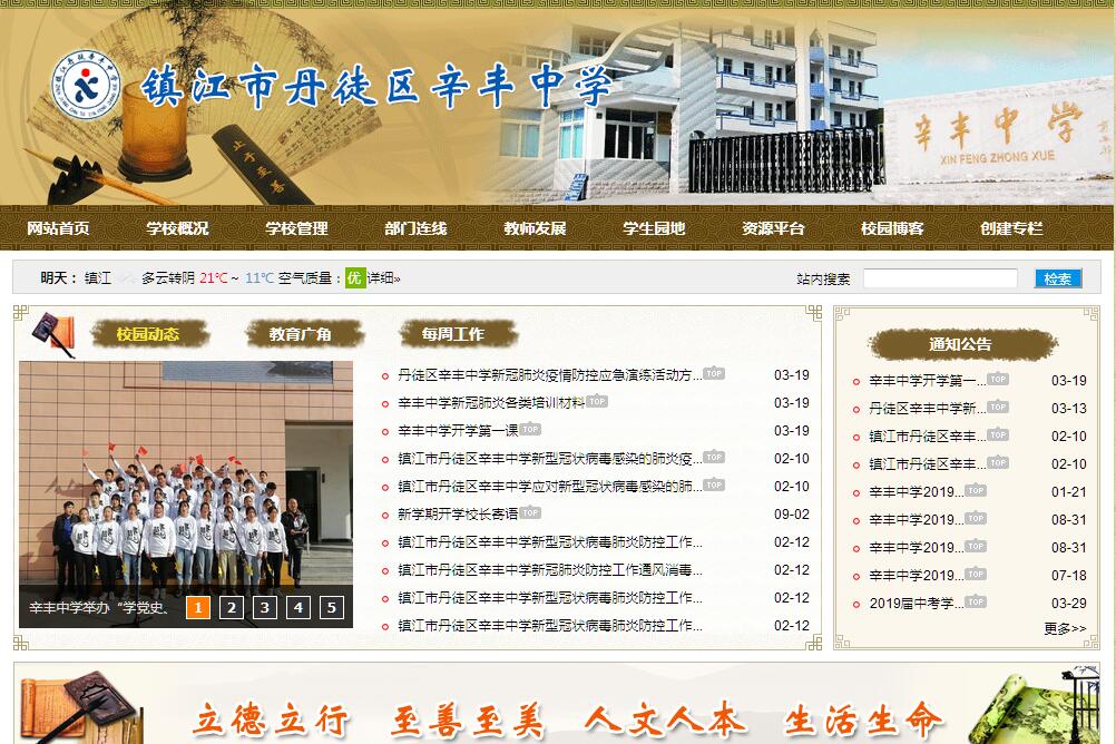 镇江市丹徒区辛丰中学创办于1956年,位于镇江市东郊风景秀丽的京杭大运河畔。校园占地面积34959平方米,建筑面积10018平方米。现有18个教学班,在校学生688人。随着全面教育现代化的推进,学校基础设施不断改善,各类教育教学装备均达到省Ⅱ类标准。学校建有可容纳300多名住宿生的学生宿舍,可容纳600人同时就餐的师生食堂;活动区有400米标准跑道和四片篮球场;至善楼有音乐室、舞蹈房、美术室、物理实验室、化学实验室、生物实验室、微机房、图书室等多个专用活动室;教室均配备了多媒体投影等现代化教学设备,开通了校园宽带网络,实现教师办公信息化;安保设施设备齐全。学校秉承“诚挚笃学”的校训,坚持贯彻“立德立行 至善至美 人文人本 生活生命”的办学理念。将师资队伍建设放在学校发展的首位,一支事业心强、业务精湛、踏实肯干、师德高尚的教师队伍逐渐形成。目前学校有专任教师64人,其中具有本科及以上学历的63人;专任教师中,市级骨干教师4人、区级骨干教师9人。学校不断深化素质教育,依托学生社团活动,积极开展体艺“2+1”专项教育活动,定期开展校园艺术节、运动会等大型活动。学校“阳光少年足球社”被评为“镇江市双百社团”,2013年,学校被纳入“镇江市足球试点学校”。学校积极创新德育教育,将特色建设融于德育教育中,各班开设“书法与修身”校本课程,取得良好的德育效果。近年来,学校发展迅速,先后获得“全国教科研先进集体”、 “省绿色学校”、“省平安校园”、“省优秀家长学校”、“市教科研先进集体”、“市装备管理与使用示范校”、“市行为规范示范校”等荣誉称号。