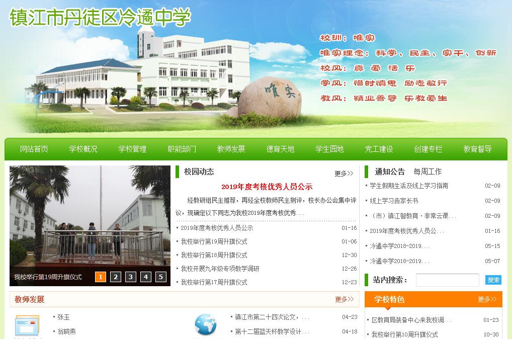 镇江市丹徒区冷遹中学地处镇江市十强乡镇之一的辛丰镇,始建于1958年,1991年10月为纪念著名民主爱国人士冷遹先生更名为“冷遹中学”。学校环境优美,占地31947平方米,校舍建筑面积8976平方米,绿化面积4050平方米,现有教学班级11个,在校生363名。学校教职工49人,其中专任教师42人,本科达标率为100%,研究生毕业1人、在读3人;有市骨干教师4名、区骨干教师7名。学校教学设施齐全,图书室、理化生实验室、音体美专用教室等均达到省义务教育学校办学条件督导标准。每个教学班级均配备了多媒体教学设备,现代教育技术设施设备的完善,大大提升了学校的办学层次和教育教学水平。学校秉承“唯实”校训,不断践行“幸福教育”。以“冷遹精神”为主线的德育教育,面向全体,很好地促进了学生德、智、体、美、劳全面发展,提高学生综合素质。学校文体活动丰富多彩,现有体育、艺术、文学、科技等四类共20个学生社团,跆拳道成为学校的特色项目。在教学中,学校积极推进高效课堂建设,学生成为了课堂的主人,学生自主探究实践,学生个性得以发展。学校坚持走科研兴校之路。现有市级课题2个,教师微课题研究达38个。教师团结奉献,积极进取,办学质量逐年提高。近年来,学校先后被授予“省实施素质教育先进学校”、“省实施教育现代化工程示范初中”、“省平安校园”、“省绿色学校”、“省和谐教育实验学校“,“省红十字示范校”、“市模范学校”、“市贯彻落实学校体育卫生工作两个《条例》优秀学校”、 “市青少年法制宣传教育工作先进集体”、 “市科普工作先进集体”、 “市无流生学校”、“市学生行为规范示范校”、“市语言文字规范示范校”、 “区文明单位”等荣誉称号。今后,全体冷中人将进一步践行“科学、民主、求真”的办学理念,为达成“全面培养、提高质量、改变校貌、培养队伍、精细管理、打造特色”的办学目标而不懈努力!