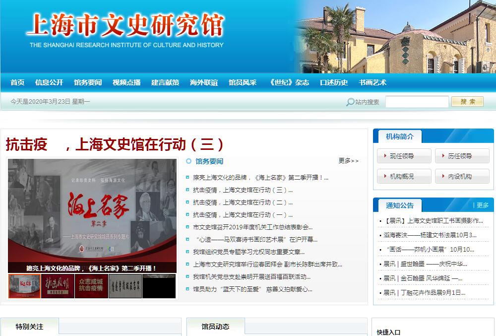 上海市文史研究馆是新中国成立后在毛泽东等老一辈领导人的关心和倡导下,党和政府为关心照顾部分无业或生活困难的党外文化、史学界老年知识分子而设立的统战性、荣誉性政府机构。上海市文史研究馆成立于1953年6月,首任馆长张元济由毛泽东主席提名、时任上海市市长陈毅亲聘。建馆以来,上海市文史研究馆秉承“敬老崇文,存史资政”的宗旨,贯彻落实党的统一战线政策在照顾和服务好馆员生活的同时,本着淡定从容、量力而行的原则组织馆员开展文史研究、著书立说、艺术创作等活动,充分发挥他们在传承和弘扬中华优秀传统文化方面的独特作用,随着时代和社会的发展,文史馆的工作任务也与时俱进。国务院办公厅《关于加强和改进政府文史研究馆工作的意见》(国办发[2011]46号),明确提出文史馆的四大主要任务,概括为:传承文化、建言献策、统战联谊和文化交流。同时明确馆员生活和工作待遇从优,要为馆员生活提供服务。上海市文史研究馆馆员由上海市人民政府市长聘任,任期终身。拟聘馆员以党外人士为主体,少量符合条件的中国共产党党员专家学者亦列入遴选范围,拟聘馆员的年龄不低于60岁,一般不高于70岁。馆员大多具有较高的学术造诣和艺术成就,或具有一定的代表性、较大的社会影响与较高的知名度。历年共延聘馆员1211人(截至2017年12月31日),名人大家汇聚,专业领域涉及文学、艺术、历史、教育、新闻、出版、翻译、表演、戏剧、传统医学、传统体育、法律等方面。上海市文史研究馆组织馆员开展各类文史研究活动,编撰出版了一系列重要书籍。与中央文史研究馆合办的综合性文史双月刊《世纪》,迄今已二十余载,成为文史研究工作服务社会的重要窗口;《上海市文史研究馆口述历史丛书》为后人了解馆员丰富人生经历提供了第一手史料;每年举办多项学术性研讨活动。上海市文史研究馆依托丰富的馆藏和书画家馆员资源,开展各类书画创作、交流、展览、研讨等文化活动,既有主题鲜明的大型展览,又有馆员个人创作展,为弘扬和创新中华优秀传统文化发作应有作用。上海市文史研究馆积极投入公益事业,开设馆员大讲坛,举办画展免费向市民开放,参加慈善义拍卖等,为传统文化的传播推广作出贡献。上海市文史研究馆组织馆员开展建言献策活动。围绕上海经济民生、社会发展、文化建设、历史建筑保护等主题,向市委市政府积极建言,受到了市领导的多次批示。上海市文史研究馆积极开展对外文化交流活动,以走出去,请进来的方式,加强与各地同行和海外文化机构的学习交流,架设沟通合作桥梁。上海市文史研究馆认真做好馆员联络和服务工作,努力保障馆员生活上和精神上的需求。上海市文史研究馆建立特聘研究员制度,组织特聘研究员参与文化活动。