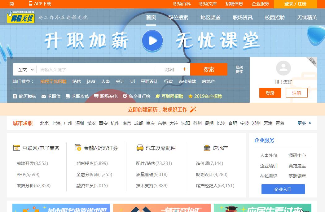 “前程无忧”(NASDAQ: JOBS) 是中国具有广泛影响力的人力资源服务供应商,在美国上市的中国人力资源服务企业。它运用了网络媒体及先进的移动端信息技术,加上经验丰富的专业顾问队伍,提供包括招聘猎头、培训测评和人事外包在内的全方位专业人力资源服务,现在全国25个城市设有服务机构,是国内领先的专业人力资源服务机构。“前程无忧”招聘猎头服务在国内创立了网站+猎头+RPO+校园招聘+管理软件的全方位招聘方案。每年为数十万家企业成功招募所需人才,帮助企业高效准确地锁定目标,用短的时间、经济的成本找到合适的人才。同时,“前程无忧”拥有过亿的个人用户,每年成功为全国求职者提供适合的工作和职业发展机会。“前程无忧”的专业培训测评顾问为企业量身定制各种公开课程、内部培训、实战模拟及体验式培训,帮助企业员工迅速提高职业水平、加强专业知识和综合素质,轻松面对工作挑战。“前程无忧”同时提供权威的人才测评工具及服务,帮助企业在招聘选拔、人才评估及发展、素质模型建立方面提供完整的解决方案。“前程无忧”的人事外包服务提供人事事务代理、人才派遣从员工招聘到退工的一站式服务与咨询,帮助企业更好地管理人力资源,节约成本,让员工轻装上阵,全力以赴!“前程无忧”组织薪酬调查、调研咨询和典范雇主评选等一系列人力资源咨询和评选活动,提供企业人力资源的前沿理论和管理实践,为企业人才管理提供分析报告和决策参考。前程无忧人才网面向全国,提供2018最新最全最准确的招聘网站信息,为企业和求职者提供人才招聘、求职、找工作、培训等在内的全方位的人力资源服务,更多求职找工作信息尽在前程无忧!