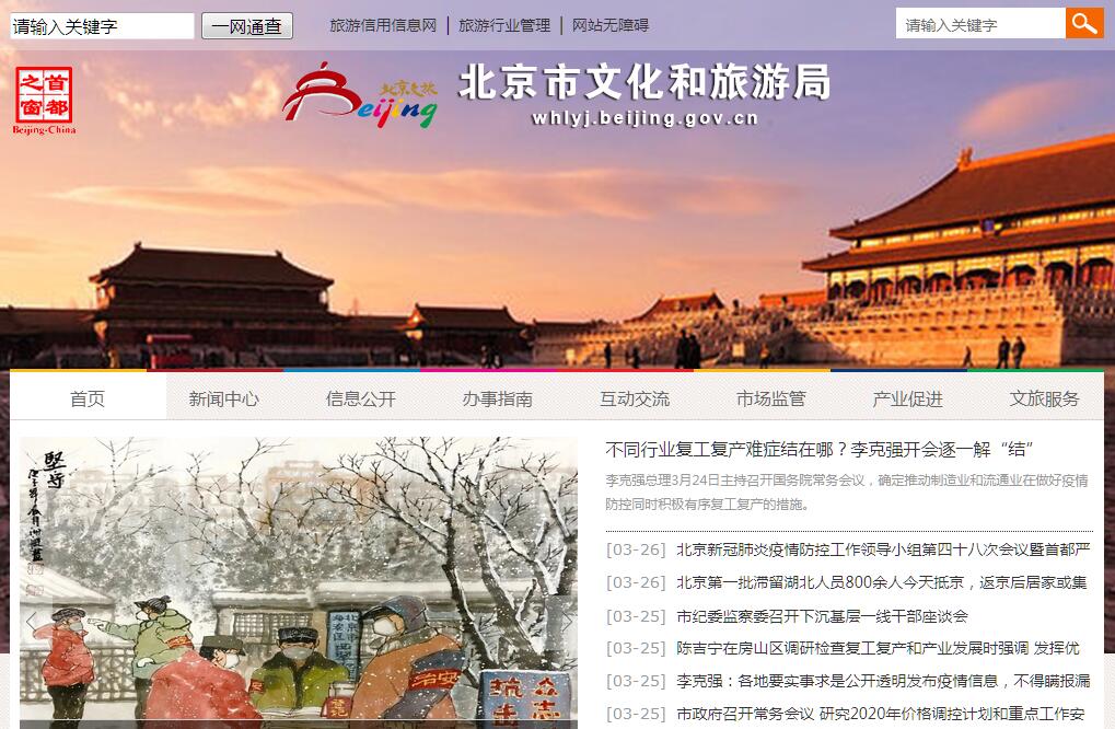 北京市文化和旅游局(简称市文化和旅游局)是市政府组成部门,为正局级。北京市文化和旅游局贯彻落实党中央关于文化和旅游工作的方针政策、决策部署和市委有关工作要求,在履行职责过程中坚持和加强党对文化和旅游工作的集中统一领导。其主要职责是:(一)贯彻落实国家文化和旅游工作法律法规、规章和政策。研究拟订本市文化和旅游政策措施。起草文化和旅游方面地方性法规草案、政府规章草案,依法监督检查执行情况。(二)统筹规划本市文化事业、文化产业和旅游业发展,拟订发展规划并组织实施,推进文化和旅游融合发展,推进文化和旅游体制机制改革。(三)管理本市重大文化活动,指导重点及基层文化设施建设和旅游设施建设,参与国家旅游整体形象的对外宣传和重大推广活动,组织本市旅游对外宣传和推广活动,促进文化产业和旅游业对外合作和市场推广,负责制定本市旅游市场开发战略并组织实施,指导、推进全域旅游。(四)指导、管理本市文艺事业,指导艺术创作与生产,扶持体现社会主义核心价值观、具有导向性代表性示范性的文艺作品,推动各门类艺术、各艺术品种发展。(五)负责本市公共文化事业发展,推进公共文化服务体系建设和旅游公共服务体系建设,深入实施文化和旅游惠民工程,统筹推进基本公共文化和旅游服务标准化、均等化。(六)指导、推进本市文化和旅游科技创新发展,推进文化和旅游业信息化、标准化建设。(七)负责本市非物质文化遗产保护、保存,推动非物质文化遗产的保护、传承、传播和发展。(八)统筹规划本市文化产业和旅游业,组织实施文化和旅游资源普查、挖掘、保护和利用工作,促进文化产业和旅游业发展。(九)指导本市文化和旅游市场发展,负责对文化和旅游市场经营进行行业监管,推进文化和旅游业信用体系建设,依法规范文化和旅游市场。(十)协助市委宣传部门指导本市文化市场综合执法,组织查处全市性、跨区域文化、文物、出版、广播电视、电影、旅游等市场的违法行为,维护市场秩序。(十一)指导、管理本市文化和旅游对外及对港澳台交流、合作和宣传、推广工作,负责组织大型文化和旅游对外及对港澳台交流活动。(十二)完成市委、市政府交办的其他任务。