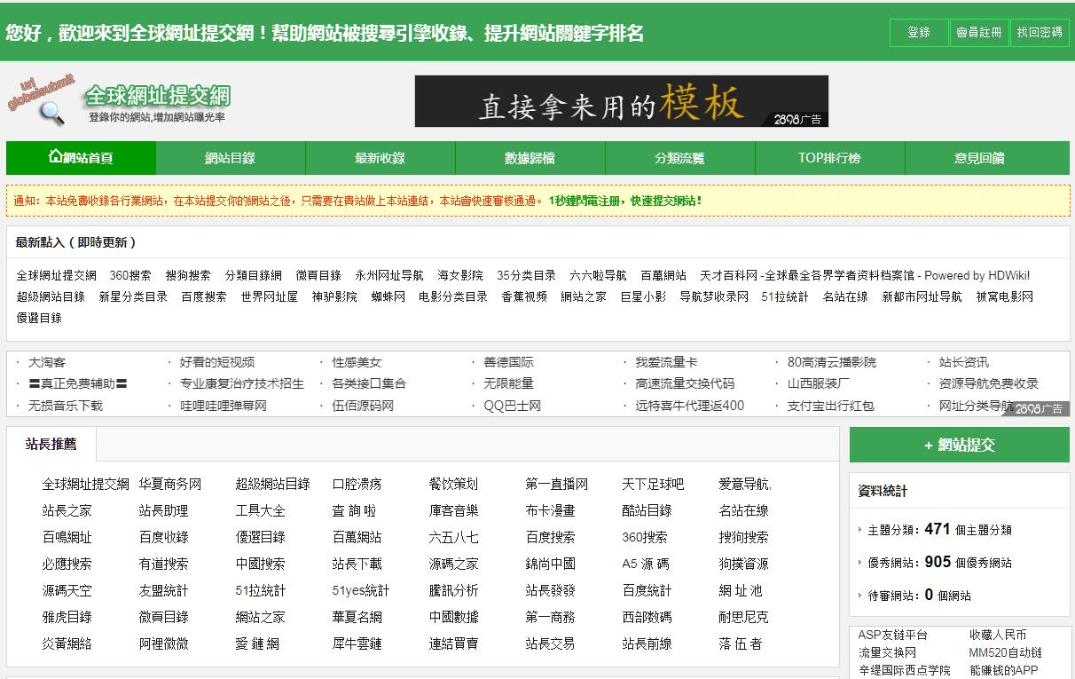| 网站简介: 全球網址提交網是全免費的網址提交目錄,收錄國內外、各行業優秀網站,為用戶提供全面的網站分類目錄網站、優秀網站參攷、友情連結交換平臺、網站推廣服務國內免費的網站提交入口(www.urlglobalsubmit.com)。 |