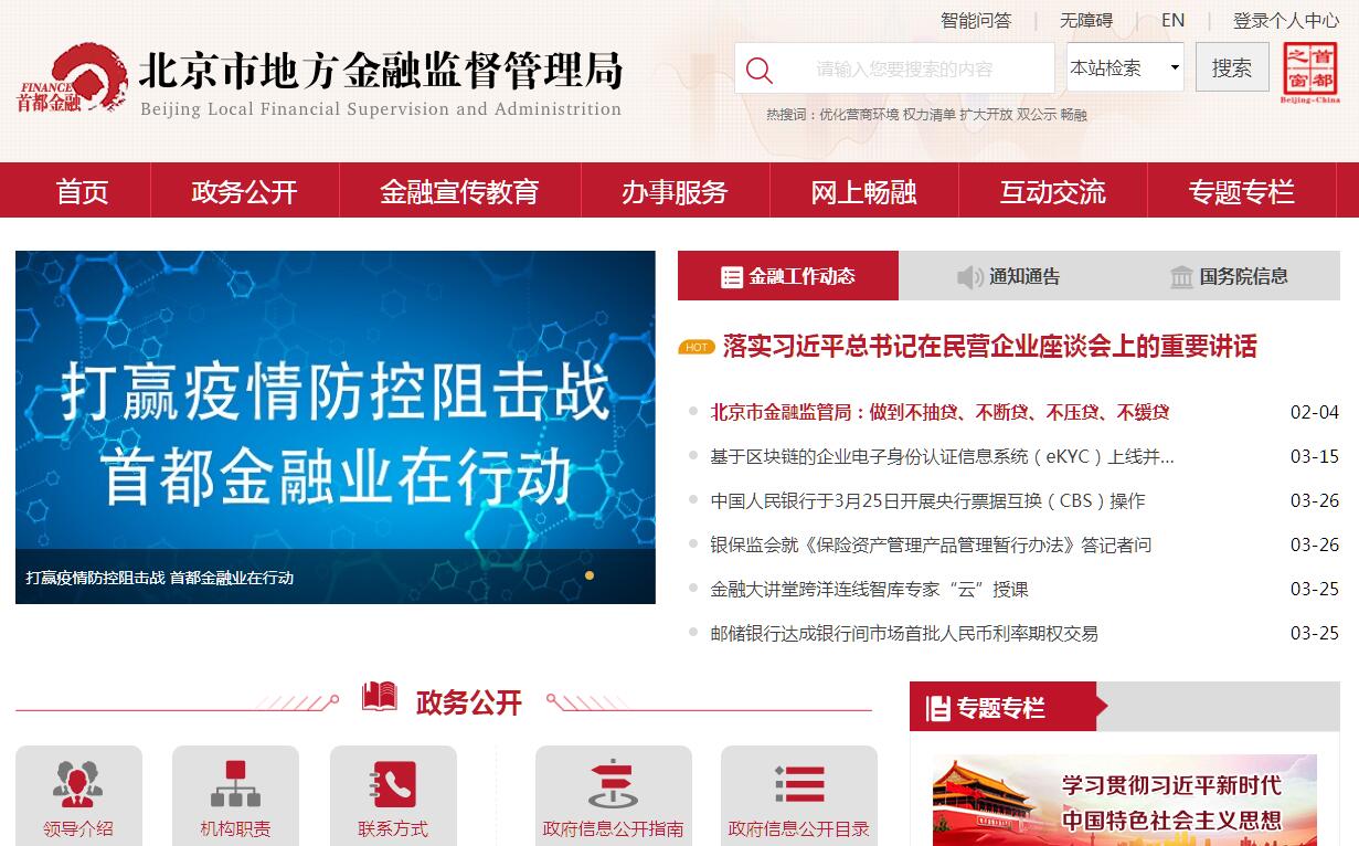 北京市地方金融监督管理局(简称市金融监管局)是市政府直属机构,为正局级,加挂北京市金融工作局(简称市金融局)牌子。北京市金融监管局(市金融局)贯彻落实党中央关于金融工作的方针政策、决策部署和市委有关工作要求,在履行职责过程中坚持和加强党对金融工作的集中统一领导。其主要职责是:(一)起草本市相关地方性法规草案、政府规章草案。配合国家金融管理部门驻京机构做好货币政策落实与金融监管相关工作。研究拟订本市金融业发展规划和政策措施,并组织实施。(二)指导、推动本市金融市场、要素市场体系建设和发展,组织推进多层次资本市场建设发展。指导、规范各类交易场所的设立和发展。指导推动地方股权交易中心规范发展。(三)统筹推进本市企业融资工作。协调推进企业上市和并购重组。协调推动企业发行公司债券、短期融资券和中期票据等债务融资工具。指导、推动天使投资、创业投资、股权(产业)投资规范发展。(四)统筹发展本市普惠金融、绿色金融、小微金融。推动农村金融体系建设和产品服务创新。协调、推进农村金融改革、创新与发展。指导农村金融综合改革试验区建设与发展。会同有关部门开展金融精准帮扶和扶贫。(五)统筹推进本市金融发展环境建设。协调推动金融机构和中介服务机构增强金融服务实体经济、科技创新和社会管理能力。建立健全金融发展服务体系,为国家金融管理部门、在京金融机构提供服务。(六)协调在京金融机构为首都经济社会发展服务。参与本市投融资体制改革工作。研究制定引导社会融资发展的政策措施。参与研究拟订政府重大项目融资方案。协调金融机构综合运用各种金融工具和平台,为重点工程、主导产业、重要区域发展和中小企业发展提供融资支持服务。(七)协调、指导金融服务本市社会民生工作。引导、协调金融机构创新服务产品,扩大服务范围,延伸服务领域,提升服务效率。(八)推进本市金融信用体系建设。配合有关部门推进企业和个人征信系统建设。参与建立信用信息共享交换机制和信用奖惩机制。(九)研究制定本市金融业发展总体布局规划,促进金融机构合理布局。会同有关部门推动现代金融体系建设,指导金融功能区的建设发展,引导金融管理部门和金融机构进驻。监测分析各金融功能区发展情况。(十)负责本市小额贷款公司、融资担保公司、区域性股权市场、典当行、融资租赁公司、商业保理公司、地方资产管理公司行政审批工作,并依法依规监管。配合推进市属金融机构改革重组。承担集体改制企业上市的产权确认职责。指导、规范金融中介机构发展。(十一)对本市投资公司、开展信用互助的农民专业合作社、社会众筹机构、地方各类交易场所等加强监管。(十二)牵头负责防范和打击金融欺诈、非法集资、非法证券期货活动等各类违法违规行为。会同有关部门查处非法金融机构和非法金融活动。负责金融突发事件应急处置工作。(十三)指导、协调本市金融人才资源开发管理和金融人才队伍建设工作。(十四)完成市委、市政府交办的其他任务。