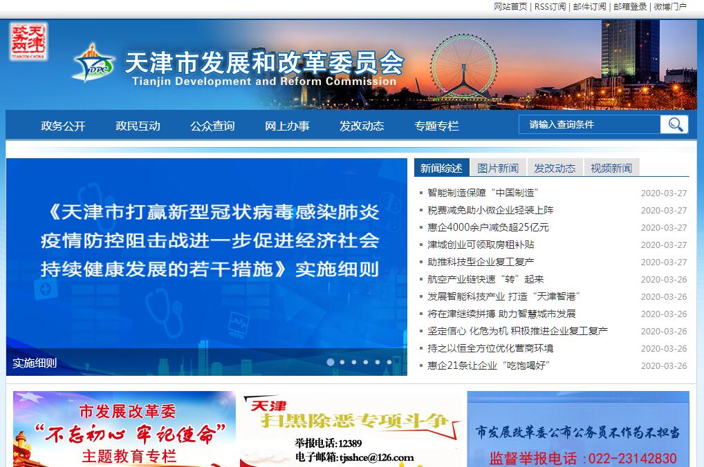 天津市发展和改革委员会,为负责统筹协调全市国民经济和社会发展、综合协调经济体制改革工作的市政府组成部门。其主要职责是:(一)贯彻落实国家关于国民经济和社会发展、经济体制改革、对外开放和价格管理等方面的法律、法规、规章和政策,起草相关地方性法规、政府规章草案并组织实施。(二)拟订并组织实施国民经济和社会发展战略、中长期规划和年度计划;组织、指导编制和衔接平衡各行业规划、专项规划、区域规划;统筹协调经济社会发展,研究分析国内外和本市经济形势,提出经济社会发展和优化重大经济结构的目标、政策,提出综合运用各种调控手段和政策的建议;受市政府委托向市人大提交国民经济和社会发展计划的报告。(三)负责监测本市国民经济和社会发展态势,承担预测预警和信息引导的责任,研究宏观经济运行、总量平衡等重要问题并提出调控政策建议,协调解决经济运行中的重大问题。(四)承担指导推进和综合协调经济体制改革的责任。研究经济体制改革和对外开放的重大问题,组织拟订综合性经济体制改革方案,协调有关专项经济体制改革方案,会同有关部门搞好重要专项经济体制改革之间的衔接。(五)承担规划重大建设项目和生产力布局的责任。拟订全社会固定资产投资总规模和投资结构的调控目标、政策及措施,衔接平衡需要安排市政府投资和涉及重大建设项目的专项规划;会同有关部门提出本市重点建设项目投资计划并推动实施;安排市政府财政性建设资金;按规定权限审批(含建议书、可行性研究报告和初步设计)、核准、审核、上报建设项目、外资项目、境外投资项目,会同行业主管部门对企业投资项目进行备案;组织推动和协调重大项目的筹划、储备工作;指导和监督国外贷款建设资金的使用,引导民间投资的方向,会同有关部门研究提出利用外资和境外投资的战略、规划、总量平衡和结构优化的目标、政策;组织开展本市重大建设项目稽察;指导工程咨询业发展;按规定指导和协调招投标工作。(六)负责汇总分析财政、金融等方面的情况,参与拟订财政政策、金融政策和土地政策;会同有关部门研究拟订政府重大项目融资方案,对全社会建设资金的平衡协调提出意见;统筹本市金融产业发展规划与国民经济和社会发展规划、计划的衔接平衡,研究提出金融促进经济发展的政策建议;参与组织推进本市社会信用体系建设;参与金融服务、金融风险防范的有关工作;负责全口径外债的总量控制、结构优化和监测工作;参与研究本市财税政策。(七)监测预测价格总水平的变动,研究提出调控目标、价格政策措施和改革建议;研究提出本市定价目录调整建议;拟订政府管理的重要商品、服务价格和收费标准的调整方案并组织实施;监督检查价格政策的执行情况,依法查处价格违法行为和价格垄断行为;规范市场价格行为,协调处理价格纠纷;组织重要农产品、重要商品和服务项目的成本调查、监审工作;提供价格认证、价格信息等服务;指导区县价格监管工作。(八)推进经济结构战略性调整,根据国家产业政策,组织拟订本市综合性产业政策,协调第一、二、三产业发展的重大问题并衔接平衡相关发展规划和重大政策,做好与国民经济和社会发展规划、计划的衔接平衡;会同有关部门提出农村经济发展战略及有关政策建议,协调农业和农村经济社会发展的重大问题;会同有关部门拟订服务业、现代物流业发展战略、规划和重大政策;组织拟订高技术产业发展、产业技术进步的战略、规划和重大政策,协调重大技术装备推广应用等方面的重大问题。(九)承担组织编制主体功能区规划并协调实施和进行监测评估的责任;研究促进区域经济协调发展的重大问题;参与研究提出滨海新区发展战略、规划和政策措施;会同有关部门组织推动示范小城镇建设。(十)分析预测国内外市场状况,研究提出贸易发展战略;组织编制要素市场发展规划,协调流通体制改革中的重大问题,并会同有关部门推进实施;协调贸易发展和市场体系建设中的重大政策;协调推进特殊监管区域的建设与发展;研究提出重要物资、商品的总量平衡的意见,组织实施国家下达的粮食、棉花等重要商品进出口计划;负责应急物资储备综合管理。(十一)负责社会发展与国民经济发展的政策衔接,组织拟订社会发展战略、总体规划和年度计划,参与拟订人口和计划生育、科学技术、教育、文化、卫生、民政等发展政策,推进社会事业建设,研究提出促进就业、调整收入分配、完善社会保障与经济协调发展的政策建议,协调社会事业发展和改革中的重大问题及政策。(十二)统筹平衡城乡建设发展战略与规划;综合分析基础设施运行状况,协调有关重大问题;组织编制基础设施发展规划和年度计划;组织协调重大基础设施项目的前期工作;综合平衡综合交通发展战略、规划和相关政策;参与研究和协调推进本市房地产发展和保障性住房建设的政策建议。(十三)组织研究提出能源发展战略和新能源的开发应用;组织编制能源发展规划,负责能源的综合平衡和宏观调控,研究提出促进能源发展及结构调整的政策;综合平衡能源的重大政策和重大事项,指导、实施能源建设与科技进步。(十四)推进可持续发展战略,负责节能减排和应对气候变化的综合协调工作;组织拟订发展循环经济、全社会能源资源