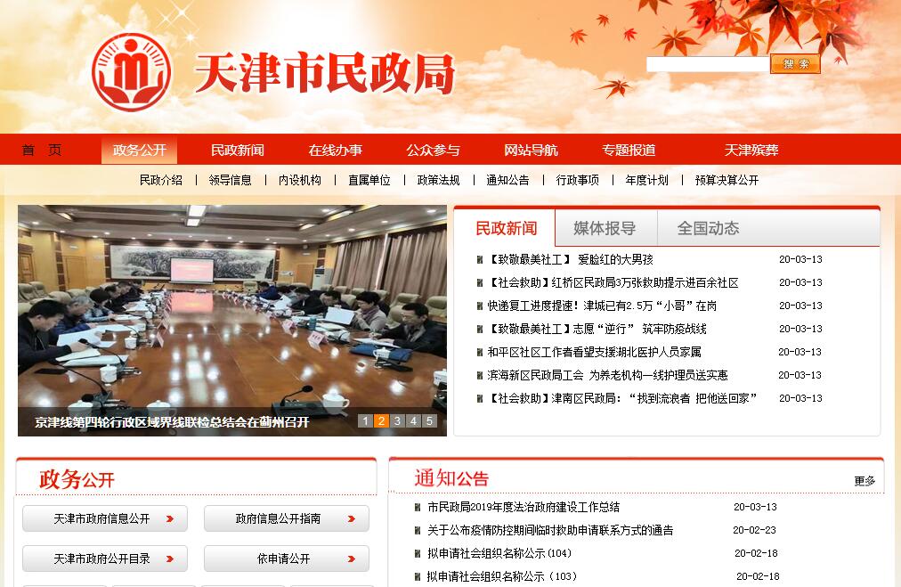 天津市民政局主要职责:(一)贯彻落实民政工作的法律法规,研究起草有关地方性法规、政府规章草案和政策文件,拟订民政事业发展规划并组织实施。(二)牵头拟订社会救助规划、政策和标准,健全城乡社会救助体系,负责城乡居民最低生活保障、临时救助、生活无着的流浪乞讨人员救助工作。(三)拟订行政区划管理政策,负责行政区域的设立、命名、变更和政府驻地迁移的审核、报批工作,负责各区界限勘定和管理工作,指导监督行政区划工作。(四)拟订城乡基层群众自治建设和社区建设政策,指导社区服务体系建设,提出加强和改进城乡基层政权建设建议,推动基层民政政治建设。(五)拟订社会福利事业发展规划、政策和标准。拟订社会福利管理和福利发行管理的有关规定。组织拟订促进慈善事业的政策,组织、指导社会捐助工作。指导老年人、孤儿和残疾人等特殊群体权益保障工作。负责指导、监督管理养老服务工作。(六)拟订婚姻管理、殡葬管理和儿童收养政策。负责推进婚俗和殡葬改革,指导婚姻、殡葬、收养、救助服务机构的管理工作。(七)会同有关部门拟订社会工作发展规划、政策和执业规范,推进社会工作人才队伍建设和相关志愿者队伍建设。(八)负责社会组织(社会团体、民办非企业单位、基金会)的登记、注销和年度检查工作,监督管理社会组织依照章程开展活动,指导、监督各区的社会组织登记管理工作。结合业务工作指导社会组织党建工作。(九)负责民政领域安全生产管理工作。(十)负责民政领域人才队伍建设。(十一)负责民政领域对外合作与交流工作。(十二)组织推动民政领域招商引资工作。(十三)完成市委、市政府交办的其它事项。