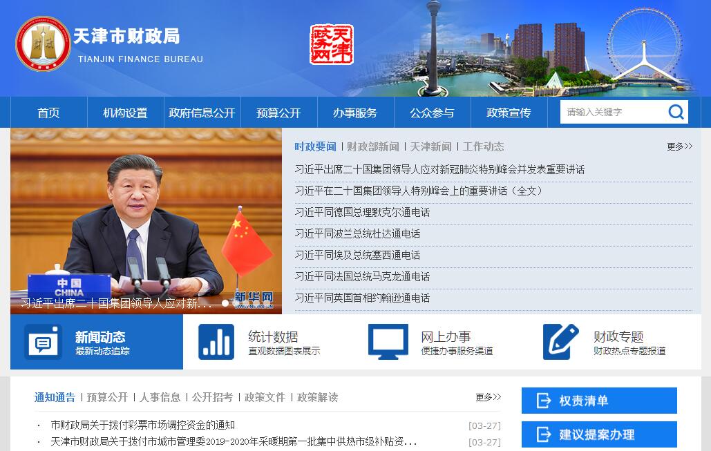 天津市财政局主要职责:(一)贯彻执行国家有关财政、税收、国有资产管理的法律、法规和方针、政策,研究起草有关地方性法规、规章草案,拟订财政中长期发展战略、规划,并组织实施。(二)参与拟订本市重大经济政策,提出运用财税政策实施宏观调控和综合平衡社会财力的建议,拟订市与区县、政府与企业财政分配政策,完善转移支付制度,拟订鼓励公益事业发展的财税政策。(三)承担市级各项财政收支管理的责任。负责编制年度预决算草案并组织执行。受市政府委托,向市人民代表大会报告预算及其执行情况,向市人大常委会报告决算。组织制定经费支出标准、定额,负责批复部门(单位)的年度预决算,会同有关部门推进财政预决算信息公开。(四)承担组织实施地方税、共享税及法律法规规定的基金(费)的征收管理责任。编制实施地方税收长远规划和年度计划。负责各种税(费)票据的管理。(五)负责政府非税收入管理,负责政府性基金管理,按规定管理行政事业性收费,管理财政票据。(六)制定本市国库管理制度、国库集中收付制度,指导和监督国库业务,按照规定开展国库现金管理。(七)会同有关部门管理财政社会保障和就业支出,拟订社会保障资金(基金)的财务管理规定,编制社会保障预决算草案,组织实施对社会保障资金(基金)使用的财政监督。(八)制定基本建设财务制度,负责财政投资评审工作,审核财政投资基本建设项目工程的概预(结)决算。负责制定政府采购制度并监督管理。负责农业综合开发项目、资金、财务制度的综合管理工作。(九)负责制定行政事业单位国有资产管理规章制度,按规定管理行政事业单位国有资产。(十)负责审核和汇总编制国有资本经营预决算草案,收取市级企业国有资本收益。组织实施企业财务制度,参与拟订企业国有资产管理相关制度,按规定管理资产评估工作。(十一)负责制定地方政府性债务管理制度,承担地方政府性债务规模控制、债券发行、预算管理、统计分析和风险监控等工作。(十二)负责管理会计工作,监督和规范会计行为,执行国家统一的会计制度,指导和监督注册会计师和会计师事务所的业务,指导和管理社会审计。(十三)负责规划和组织实施地方税收纳税服务体系建设,制定纳税服务管理制度。组织实施纳税评估工作,负责税收风险应对。组织实施对纳税人进行分类管理的专业化服务,对大型企业的纳税服务和税源管理。(十四)负责制定财税管理信息化制度,拟订财税管理信息化建设中长期规划,组织实施金财、金税工程建设。开展财税理论政策研究,负责财税宣传和财税信息、咨询工作。负责财税系统教育培训工作。(十五)负责制定政府购买服务指导性目录,建立政府购买服务的招投标和监督评估制度。(十六)承办市委、市政府交办的其他事项。