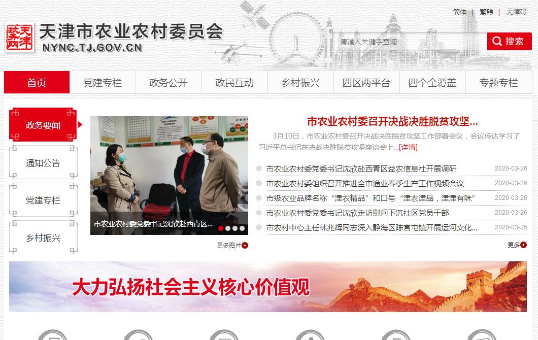 天津市农业农村委员会是市政府组成部门,为正局级。天津市农业农村委员会贯彻落实党中央关于“三农”工作的方针政策、党中央和市委关于“三农”工作的决策部署,在履行职责过程中坚持和加强党对“三农”工作的集中统一领导。其主要职责是:(一)统筹研究和组织实施本市“三农”工作的发展战略、中长期规划、重大政策。贯彻落实“三农”工作法律法规,研究起草有关地方性法规、政府规章草案,拟订相关地方性规范、标准,并组织实施。指导农业综合执法,参与涉农的财税、价格、收储、金融保险、进出口等政策制定。(二)统筹推动发展农村社会事业、农村公共服务、农村文化、农村基础设施和乡村治理。牵头组织改善农村人居环境。指导农村精神文明和优秀农耕文化建设。(三)拟订深化农村经济体制改革和巩固完善农村基本经营制度的政策。负责农民承包地、农村宅基地改革和管理有关工作。负责农村集体产权制度改革,指导农村集体经济组织发展和集体资产管理工作。指导农民合作经济组织、农业社会化服务体系、新型农业经营主体建设与发展。(四)指导乡村特色产业、农产品加工业、休闲农业和乡镇企业发展工作。提出促进大宗农产品流通的建议,培育、保护农业品牌。发布农业农村经济信息,监测分析农业农村经济运行。承担农业统计和农业农村信息化有关工作。(五)负责种植业、畜牧业、渔业、农垦、农业机械化等农业各产业的监督管理。指导粮食等农产品生产。组织构建现代农业产业体系、生产体系、经营体系,指导农业标准化生产。负责远洋渔业管理和渔政渔港监督管理。指导农业机械化发展和农机安全监理。负责农业领域安全生产监督管理工作。(六)负责农产品质量安全监督管理。组织开展农产品质量安全监测、追溯、风险评估。会同有关部门实施农产品质量安全国家标准。指导农业检验检测体系建设。(七)组织农业资源区划工作。指导农用地、渔业水域以及农业生物物种资源的保护与管理,负责水生野生动植物保护、耕地及永久基本农田质量保护工作。指导农产品产地环境管理和农业清洁生产。指导设施农业、生态循环农业、节水农业发展以及农村可再生能源综合开发利用、农业生物质产业发展。牵头管理外来物种。(八)负责有关农业生产资料和农业投入品的监督管理。组织农业生产资料市场体系建设,监督有关农业生产资料国家标准实施。实施兽药质量、兽药残留限量和残留检测方法国家标准。组织兽医医政、兽药药政药检工作,负责执业兽医和畜禽屠宰行业管理。(九)负责农业防灾减灾、农作物重大病虫害防治工作。指导动植物防疫检疫体系建设,组织、监督动植物防疫检疫工作,根据权限发布疫情并组织扑灭。(十)负责农业投资管理。编制市级投资安排的农业投资项目建设规划,提出农业投资规模和方向、扶持农业农村发展财政项目的建议,按市政府规定权限审批农业投资项目,负责农业投资项目资金安排和监督管理。负责农业综合开发项目、农田整治项目、农田水利建设项目管理工作。(十一)推动农业科技体制改革和农业科技创新体系建设。指导农业产业技术体系和农技推广体系建设,组织开展农业领域的高新技术和应用技术研究、科技成果转化和技术推广。负责农业转基因生物安全监督管理和农业植物新品种保护。(十二)指导农业农村人才工作。拟订农业农村人才队伍建设规划并组织实施,指导农业教育和农业职业技能开发,指导新型职业农民培育、农业科技人才培养和农村实用人才培训工作。(十三)牵头开展农业对外合作工作。组织推动农业领域招商引资、引进技术和智力及对外交流,组织开展农业贸易促进和有关国际交流合作,参与实施国家间有关农业援助项目。(十四)完成市委、市政府交办的其他事项。