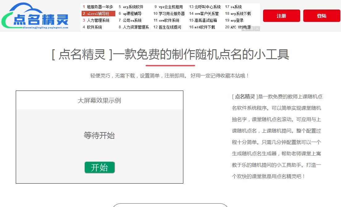 | 网站简介: 随机点名精灵是一款免费的教师上课随机点名软件系统程序课堂随机抽名字软件,可以实现课堂随机点名滚动。只需几分钟配置就可以一个生成随机点名生成器。 |