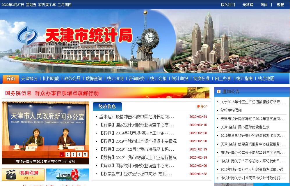 天津市统计局主要职责是:(一)贯彻执行国家有关统计的法律、法规和方针、政策,研究起草有关地方性法规、规章草案和政策,并组织实施。拟订全市统计事业发展规划。承担组织领导和协调全市统计工作,确保统计数据真实、准确、及时的责任。(二)负责贯彻执行国民经济核算体系,组织实施全市及各区国民经济核算制度和全市投入产出调查,核算全市及各区地区生产总值,汇编提供国民经济核算资料,监督管理各区国民经济核算工作。(三)会同有关部门拟订本市重大国情国力普查计划、方案,组织实施全市人口、经济、农业等重大国情国力普查,汇总、整理和提供有关统计数据。(四)组织实施全市国民经济各行业的统计调查,收集、汇总、整理和提供有关调查的统计数据。综合整理和提供旅游、教育、卫生、社会保障、公用事业等全市性基本统计数据。(五)组织实施能源、投资、收入、科技、人口、劳动力、社会发展基本情况、环境基本状况等统计调查;收集、汇总、整理和提供有关调查的统计数据。综合整理和提供资源、房屋、对外贸易、对外经济等全市性基本统计数据。(六)组织各区、各部门的经济、社会、科技和资源环境统计调查。统一核定、管理、公布全市性基本统计资料。定期发布全市国民经济和社会发展情况的统计信息。(七)对国民经济、社会发展、科技进步和资源环境等情况进行统计分析、统计预测和统计监督,向市委、市政府及有关部门提供统计信息和咨询建议。(八)组织实施国家统计标准,制定和修订地方统计标准。依法审批市级各部门、各区统计调查项目。指导专业统计基础工作、统计基层业务基础建设,建立服务业统计信息管理制度,建立健全统计数据质量审核、监控和评估制度,开展对重要统计数据的审核、监控和评估,依法监督管理涉外调查活动。(九)协助各区管理区统计局局长和副局长任免,指导全市统计专业技术队伍建设,会同有关部门组织管理全市统计专业资格考试、职称评审和统计从业人员岗位培训工作,管理全市区以上政府统计部门中央财政下拨的统计事业费。(十)建立并管理全市统计信息自动化系统和统计数据库系统,组织制定各区、各部门统计数据库和网络的基本标准和运行规则,指导区统计信息化系统建设。(十一)承办市委、市政府和国家统计局交办的其他事项。