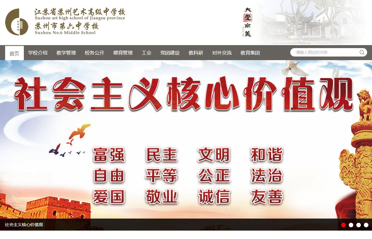 江苏省苏州艺术高级中学校即苏州市第六中学,建于1940年,原名为私立有原学校。1953年改名为苏州市第六中学,2007年经苏州市教育局批准增名为苏州市艺术高级中学校,2009年经江苏省教育厅批准更名为江苏省苏州艺术高级中学校。学校坐落在著名的世界文化遗产拙政园东侧,校园西部的明代建筑系进士许乃钊的故居,现列为苏州文物控保单位。学校素以幽美的校园环境、深厚的文化积淀、儒雅的艺术氛围享誉省内外。六十九年来,学校培养了2万多名学子,迹遍五湖四海。涌现了一大批优秀人才,如中科院院士王家骐、程耿东、丁大钊,中国工程院院士顾健人等。1999年,我校经江苏省教委批准为:国家级示范性普通高中标准的省级重点中学,2000年被教育部授予“全国学校艺术教育工作先进单位”,2004年学校由省教育厅批准成功转评为省首批四星级高中。江苏省苏州艺术高级中学校是全省第一所依托普通高中建立的艺术特色学校。学校以艺术特色教育为立校之本,勇于改革,锐意进取,将浓厚的艺术氛围、先进的办学理念和谐有机的统一起来,将艺术教育做大、做优、做强,取得了巨大的办学成效、丰硕的办学成果,将努力打造成为全省普通高中艺术教育品牌学校,全市艺术教育龙头学校。学校正建设成为一所特色鲜明、艺术浓厚、品牌化、精品化的国内外艺术教育名校。