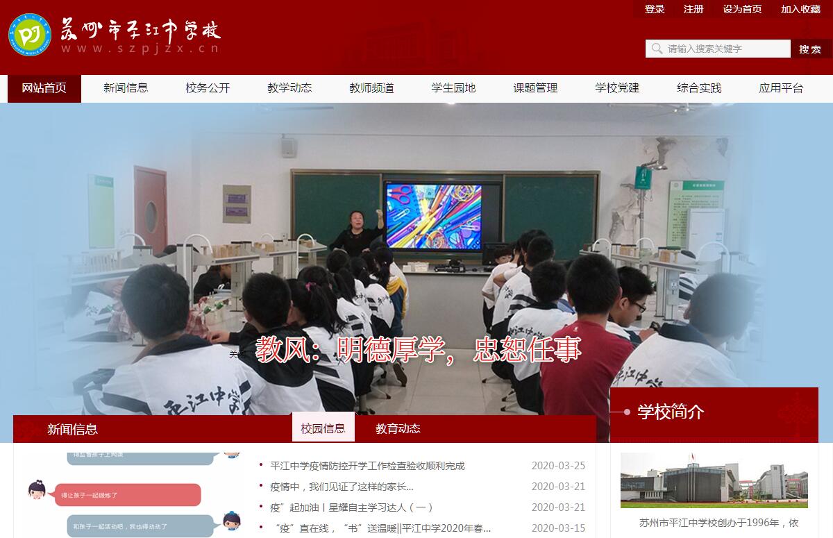 苏州市平江中学校创办于1996年,依托于苏州百年名校——苏州市第三中学校,为苏州市首批民办公助初级中学。2010年,根据苏州市教育局直属初中校布局调整方案,平江中学脱离母体,独立办学,从学士街389号整体搬迁至二十中校址(东环路1555号三新路三星桥)办学,性质为市教育局直属公办初中。传承文明创伟业,继往开来谱新篇。平江中学虽几经变迁,但始终继承和发展百年名校的优良传统,全面汲取前人的办学思想之精华,创新办学思路,以丰厚的传统奠基,以优良的作风树魂,以优秀的教师固本,以一流的质量立校,励精图治,开拓进取,使学校不断踏上新台阶。面对布局调整所带来的机遇与挑战,学校提出了“回归教育本真,服务社会大众,凝练特色内涵,树立品牌形象”的办学目标,积极探索减负增效的有效途径和办法,探索出了一条“个性化学习”的教学创新之路,逐步形成了以“四段一案一回头”教学模式为根本的个性化课堂、以“小抄”为主要形式的个性化考试和以“达人风云榜”评选活动为抓手的个性化评价,并开始产生影响,成为一所在省内外有一定知名度和影响力的品牌学校。学校秉承“德立于行,学以致用”的校训,确立了以“团结、务实、力行、高效”的干部队伍建设目标,积极倡导“明德厚学忠恕任事”的教风,造就了一支同心同德、团结奋进、务实进取、勇于开拓的干部队伍和一支师德高尚、业务精湛、治学严谨、敬业乐教的教师队伍。近年来,学校先后荣获苏州市文明单位、苏州市指导学生自学教学改革实验学校、苏州市教育信息化示范学校、苏州市五五普法示范学校、苏州市语言文字规范化示范学校、市教育局先进基层党组织、全国语文教学改革示范学校、全国基础教育英语综合能力竞赛优秀组织奖等荣誉,中国少科院科普教育示范基地、全国社会工作服务组织试点工程试点单位。并成为华东师范大学名师培养基地。春秋走笔,风鹏正举写辉煌;弘歌如梭,呕心沥血谱华章。打造江苏省乃至全国课改名校是苏州市平江中学的发展方向和目标,作为一所苏州市的品牌学校,不能徜徉留恋于过去的辉煌,应该奋勇争先,在自己的领域披荆斩棘,大胆探索,只有一步领先,才能步步领先。可以这样说平江中学是一所老百姓家门口的好学校,她因超越而美丽!