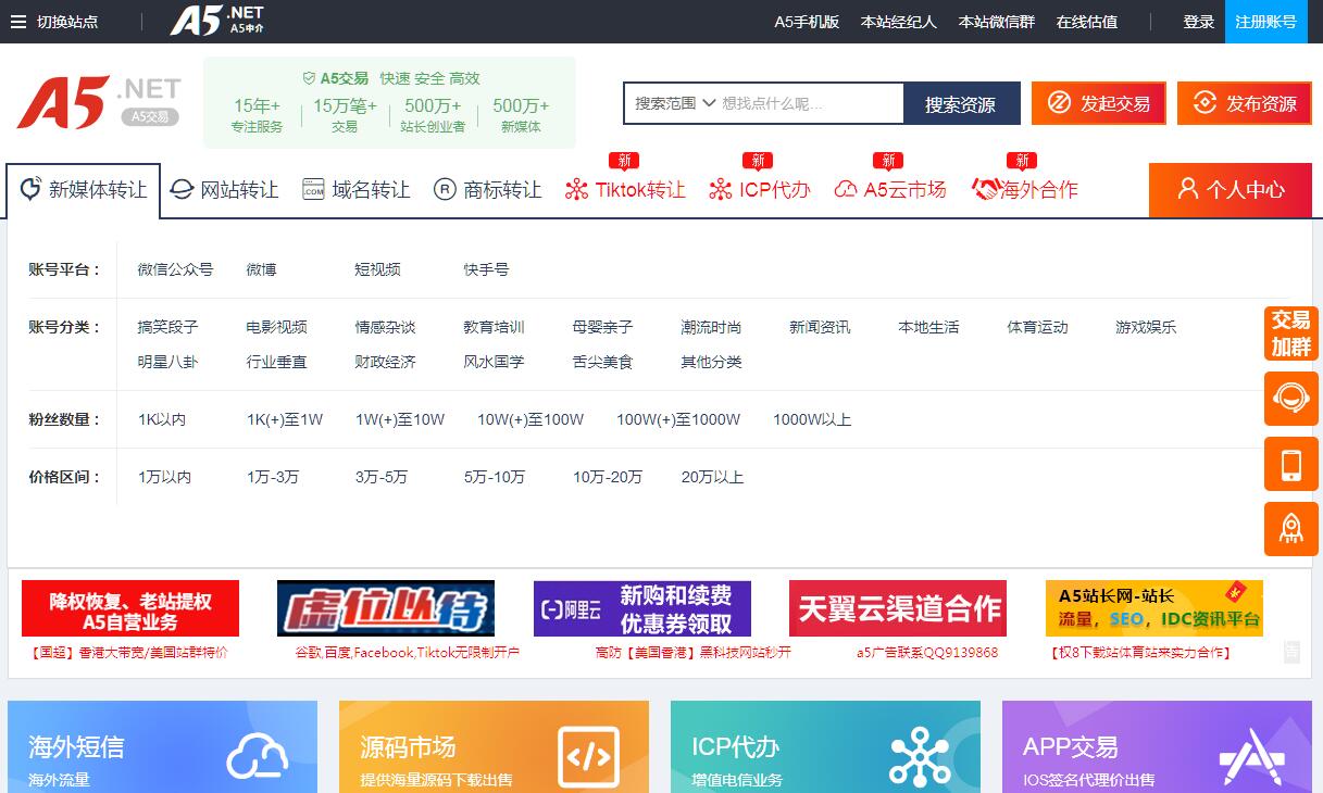 | 网站简介: A5交易(www.a5.net),互联网资源交易平台,提供域名网站、新媒体、商标、网店等交易服务。 |