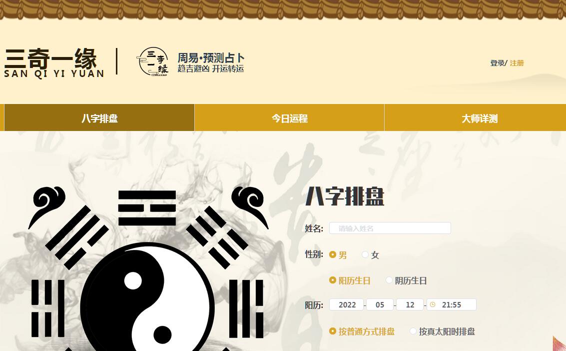 | 网站简介: 三奇一缘是专业的婚姻测算服务平台,为您提供排盘、免费算命、婚姻、姻缘、财富、运势、吉凶、八字详批等服务。 |