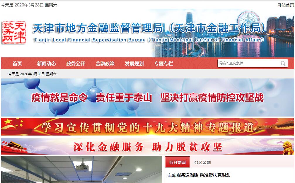 天津市金融工作局(天津市地方金融监督管理局)为负责服务、协调和管理天津市金融工作的市政府直属机构,正局级规格。其主要职责是:1、贯彻国家有关金融法律、法规和方针、政策,会同有关部门研究起草有关金融工作地方性法规、规章草案,拟订有关政策并组织实施。2、负责拟订金融业发展规划,研究分析宏观金融形势、国家金融政策和本市金融运行情况,提出对策建议。3、建立健全金融服务体系,为国家金融管理部门、驻津金融机构做好服务工作和信息交流工作,为本市地方法人银行业、证券期货业、保险业、各类新型金融及金融服务机构规范发展提供服务。4、负责加强对新型农村合作金融组织的引导和规范。5、负责完善、规范本市资本市场体系工作,为本市企业利用各种直接融资方式进行融资提供协调服务。6、负责推动本市企业改制、挂牌上市工作,会同有关部门做好上市公司的规范发展工作。7、建立健全金融监督管理体系,负责制定对各类新型金融及金融服务机构和新金融业务管理的政策措施,负责做好全市政府性投融资平台公司融资服务和风险防控管理工作。8、承担本市吸收少数客户资金、限定业务范围、风险外溢性较小的金融活动的监管职责。依照国家有关法律法规,牵头负责本市小额贷款公司、融资性担保机构、区域性股权转让市场,以及地方资产管理公司等新型金融服务机构和经营范围带有金融服务内容的机构的日常监管,承担相应的风险处置责任。9、负责防范和化解地方金融风险。加强对所监管机构的风险监测评估、风险预警和风险处置,配合中央金融管理部门加强对本地区跨市、跨行业交叉性金融业务的监测分析和风险管理。10、负责本市金融监管职责范围内的金融消费者权益保护工作,加强金融知识宣传,增强金融消费者自我保护能力,督促监管职责范围内的金融服务机构加强信息披露和消费者风险提示。11、会同中央金融管理部门共同建立和完善所监管机构的统计制度和信息管理系统,定期组织统计资产负债、利润、风险状况等工作。12、组织开展金融业合作交流工作,配合推动金融聚集区建设,推进各类金融资金信息对接平台建设,配合有关部门推进社会信用体系建设。13、承办市委、市政府交办的其他事项。
