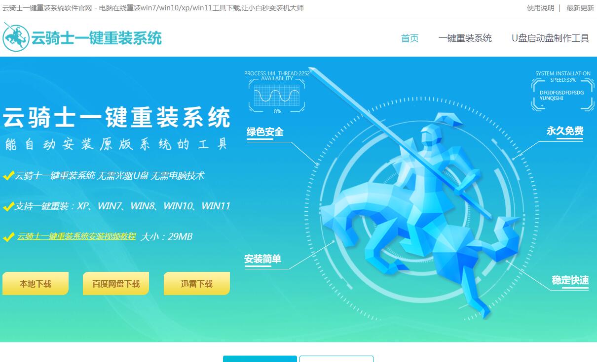 | 网站简介: 云骑士一键重装系统软件是一款绿色、安全、免费的在线重装win7/win10/xp/win11系统的工具,软件自带原版系统下载,0基础的小白也能秒变装机大师,在线极速重装只需简单几步,就能让你的电脑焕然一新。 |