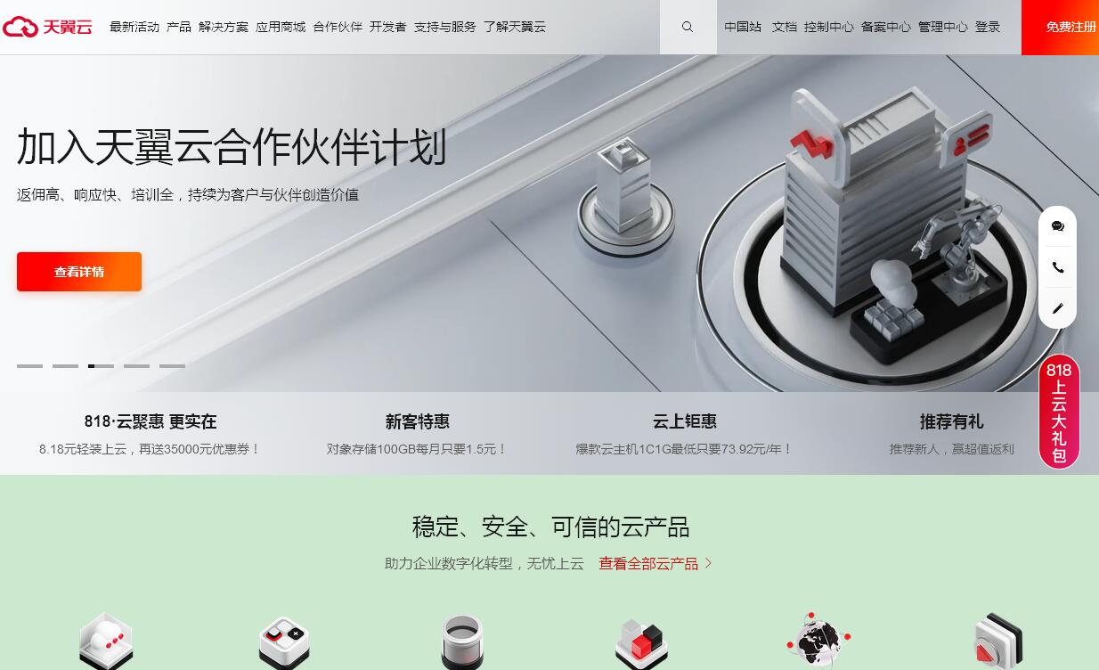 | 网站简介: 天翼云是中国电信旗下一家科技型、平台型、服务型公司,以"云网融合、安全可信、专享定制"三大优势向客户提供公有云、私有云、专属云、混合云、边缘云、全栈云服务,满足政府及企业数字化转型需求。 |