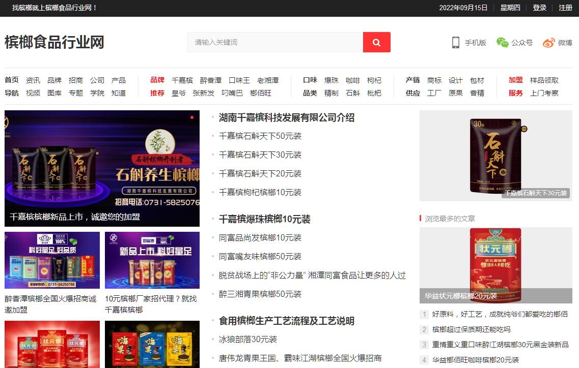 | 网站简介: 湖南千嘉槟科技发展有限公司是湘潭槟榔厂家、专注研发、生产、销售。主营产品石斛天下槟榔、 醉香潭槟榔、醉香潭爆珠槟榔、枸杞槟榔、青果精致槟榔。开创槟榔代理创业,打造一流品牌。 |