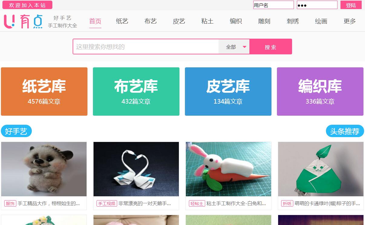 | 网站简介: 有点网,手上有点活儿,分享各种手工制作教程!主要内容包括:纸艺折纸、剪纸、卷纸,布艺包包、服饰、玩偶,皮艺皮包、皮具、饰品,软陶、轻粘土、橡皮泥,编织中国结、毛线针织、藤编草编,雕刻雕塑、骨雕、根雕、核雕、玉雕、木雕,刺绣、十字绣,绘画等等手工制作教程大全。有点网,好手艺! |
