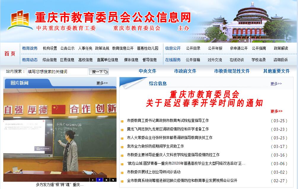重庆市教育委员会主要职责是:(一)贯彻执行教育工作的法律、法律、法规和方针政策,起草教育地方性法规、规章,拟订教育事业发展规划和教育政策,指导全市教育工作。(二)负责全市各级各类教育的统筹规划和协调管理,管理市属高校、所属事业单位,负责全市教育体制改革,负责高中阶段及以上学校的布局结构调整;指导各级各类学校的教育教学改革、课程教材建设及教育科研工作;负责教育统计、信息工作。(三)负责推进义务教育均衡发展和促进教育公平;负责义务教育的指导与协调,组织实施促进公共教育资源进一步向农村和民族地区倾斜的政策措施,实施基础教育教学改革;指导普通高中教育、幼儿教育和特殊教育工作,全面实施素质教育。(四)负责全市教育督导工作;负责全市基础教育发展水平、质量监测工作,负责对区县(自治县)教育工作进行监督、检查和指导。(五)指导以就业为导向的职业教育的发展与改革,组织实施深化职业教育教学改革的政策措施,指导职业院校提高办学水平和质量。(六)负责全市高等教育发展与改革,承担提高高等教育质量和创新水平、推进产学研一体化的责任;统筹指导各类高等教育和继续教育工作。(七)负责本部门教育经费的统筹管理;督促检查区县(自治县)对教育的财政拨款和教育税费的征收工作,参与教育经费的审计监督;负责教育经费的安排和预决算工作;负责教育援助的管理;监督检查区县(自治县)招生经费收支情况。(八)统筹管理、协调民办教育,拟订民办教育管理的政策措施,规范办学秩序,承担民办教育监管的责任。(九)指导各级各类学校的思想政治工作、德育、体育卫生艺术教育和国防教育等工作。(十)主管全市教师工作,负责实施教师资格制度,指导教育系统人才队伍建设;负责教育系统机构编制、人事和社会保障及教育培训、人事调配、职称评定工作。(十一)负责全市的学历教育、学位和学籍管理工作,参与拟订普通高校毕业生就业政策,指导普通高校开展大学生就业、创业工作。(十二)负责大学中专招生工作;负责高等教育、中等教育的招生计划;负责各类教育考试、录取管理工作。(十三)组织、指导高校重点学科、重点实验室、精品特色专业课程建设;组织高校承担国家及本市重大科研项目,规划、指导教育系统的自然科学和哲学、社会科学研究,发展高新技术及推进科研成果转化工作。(十四)归口管理教育系统的对外交流和外事工作;负责与国际及港澳台地区的教育合作、交流;负责教育系统侨务工作。(十五)管理、指导全市的语言文字工作;制定语言文字工作中长期规划;负责普通话培训测试工作。(十六)负责对各类学校的国有资产进行宏观管理;指导学校校建设、教育装备、教育产业、勤工俭学、学校后勤改革工作。(十七)承办市委、市政府交办的其他事项。