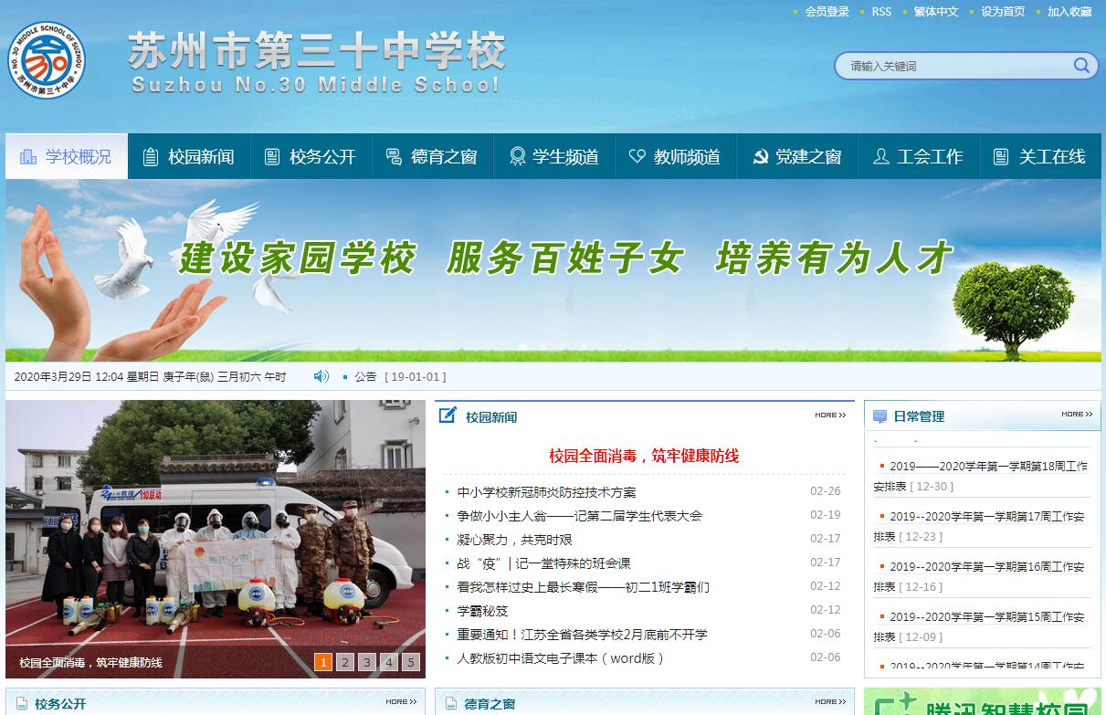 苏州市第三十中学校始建于一九七〇年八月,为一所教育现代化初中校。学校南邻西园、留园,西毗虎丘山麓,北枕山塘清波,校园林木扶疏芳草萋萋,周边粉墙黛瓦古巷深深。步入不惑的三十中学,小巧中显井然,错落中呈别致,隽永清秀,人杰地灵。自2004年秋季始,我校确立了“家园学校”的发展目标,旨在“建设家园学校,服务一方社会”。针对我校施教区地处城西,弱势人群蜗居,外来人员云集,家庭教育条件差、基础弱的特点,我们加大对学生的服务力度,延长学校的服务时间,长期坚持教师全天候校园值班巡视和课余、周六的免费义务辅导,为众多来自弱势群体的孩子营造和谐安全、充满温情的学习时空。为此,朱永新副市长欣然题词“建设家园学校,回报人民群众”。2006年我校在“家园学校”已经取得较大成果的基础上,隆重推出“德育导师”制,转变普通教师的角色为“德育导师”,全体教职工均以“家园学校”中的朋友加导师及学生校内监护人的多重身份给德育注入了更多的亲情与友情。德育导师们奉献自我的同时,也在不断的收获着成功的喜悦,市领导的题词“这是非常好的做法。今后应充分发挥学科老师在德育中的作用,导师制可以在中小学试行并推广”。2008年,“德育导师制”被评为苏州市精神文明建设创新案例二等奖。“草桥实验班”为我校与苏州市草桥实验中学联合举办。由我校优秀骨干教师任教,并聘请草桥实验中学的教师担任客座教师,定期到我校为草桥实验班的学生授课。“草桥实验班”的学生可享受推荐入四星级高中的优惠政策待遇,苏州市第一中学每年专拨一定数量的高中段招生推荐名额用于录取“草桥实验班”学生。自2008年秋季起,由我校承办市政府爱心工程之一“成功班”。我校招收的“成功班”,将免除原“一贯制”所规定的全部五项收费,免除社会实践费、体检费和校服费等;还将免费给予每位学生一份意外伤害保险,免费提供在校学习期间的午餐;为路途较远的学生免费提供公交月票;向优秀学生颁发奖学金等。“成功班”的每位学生在校三年期间,政府、学校以及社会捐赠累计每人补贴近万元。从2008年起,我校开启了一场“马拉松式”的“课堂教学模式系列改革实践与探索”的征程。当时学校提出了一个“坚持”、三个“不怕”(即:不怕阻力、不怕困难、甚至不怕失败;不管遇到什么情况一定要坚持)的课改指导思想。2011年9月,开启“第二轮课改”,指导思想为:“培养学生自主学习的意识、养成学生自主学习的习惯、提高学生自主学习的能力”。第三轮课改于2014年秋季学期开始,其核心是“分类指导,因材施教”。同时,我们引进了“小组合作制”学习教育教学模式。如今,我校教学质量稳步提高,中考合格率逐年攀升,在全体三十中师生的共同努力下,在上级领导社会各界朋友的帮助支持下,学校取得了许多骄人的成绩。校风、班风、教风、学风不断上台阶,德育导师制全大市推广,教学质量连年攀升,我校的广播操和大课间曾在苏州市评比中均获一等奖第一名,我校还获得了2006——2008年度、2009—2011年度、2012——2014年度连续三届苏州市文明单位的殊荣。