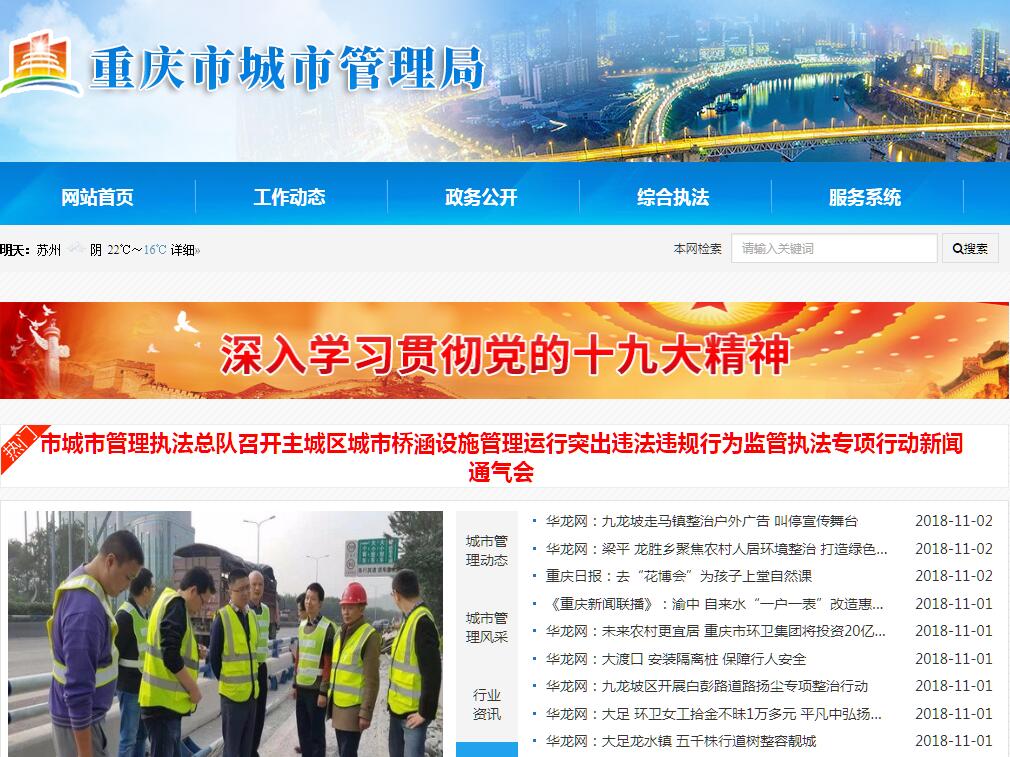 重庆市城市管理局,是重庆市机构改革新组建的单位,是重庆市政府组成部门。其主要职责:(一)贯彻执行国家有关市政公用设施运行管理、市容环境卫生管理、城市供水节水排水管理、园林绿化管理、城市管理执法等城市管理和风景名胜区管理的法律、法规、规章和方针政策;会同有关部门研究起草本市城市管理和风景名胜区管理方面的地方性法规、规章和有关政策并组织实施;统筹城市管理领域重大事项,负责拟订城市管理和风景名胜区发展战略、规划、计划并组织实施。(二)负责城市管理和风景名胜区管理行业规范和技术标准体系建设;负责市直管城市管理基础设施维护工程技术方案的审查;负责城市管理工作的组织协调、监督检查和考核评价。(三)负责市直管城市道路、桥梁、隧道等设施的维护管理;负责市直管城市道路照明、景观照明等城市照明设施建设、维护的管理;负责区县(自治县,以下简称区县)市政设施维护管理的指导监督;指导主城区市级社会单位市政设施维护管理工作。(四)负责主城区路桥通行费征收管理;负责全市行政区域内停车场管理工作的指导协调和监督。(五)负责城市供水、节水、排水、污水处理的监督管理;负责城市供水水质监督管理;负责城市二次供水管理;指导区县城市供水、节水、排水与污水处理管理工作;负责城镇污水处理费征收管理;负责城市供热管理。(六)负责城市环境卫生管理;负责城市水域环境卫生管理;负责城市生活垃圾处置费征收管理和城市环境卫生设施管理;指导区县环境卫生管理工作。(七)牵头组织开展主城区市容环境综合整治;指导区县城市市容环境综合整治工作。(八)指导监督城市户外广告、店招店牌设置管理工作。(九)负责城市生活垃圾、城市建筑垃圾、城市水域垃圾等处置的监督管理;负责城市生活垃圾经营性服务的监督。(十)负责农村生活垃圾治理的业务指导和监督管理;负责乡镇污水处理的业务指导和监督管理。(十一)组织编制市级绿地系统规划并组织实施,会同有关部门负责城市绿线的划定和监督管理工作;指导区县绿地系统规划编制和实施工作、城市绿线划定和监督管理工作;依法负责建设项目绿化工程设计方案管理工作。(十二)负责全市园林绿化管理和城市公园行业管理;组织开展城市义务植树活动;负责城市古树名木保护管理;城市公园应急避难场所的规划、建设、管理工作。(十三)负责园林绿化行业市场管理;指导监督园林绿化工程招投标、定额、质量管理。(十四)负责风景名胜区的设立、规划编制、审查和报批以及监督管理工作。(十五)负责组织申报世界和国家自然遗产、自然与文化双重遗产;指导监督遗产地管理工作;会同有关部门做好国家公园的有关工作。(十六)负责授权范围内的城市管理综合行政执法工作;指导监督区县城市管理综合行政执法工作。(十七)负责城市管理行业安全生产工作的监督、管理和指导;负责城市管理行业应急管理、应对处置的组织、协调和指导。(十八)负责城市管理的数字化、智慧化建设与运行的监管;负责城市管理的科学研究和教育工作;组织城市管理的重大科技成果鉴定;指导城市管理高新技术推广与运用;负责城市管理的对外交流与合作;开展城市管理行业人员培训。(十九)负责制定机关及所属单位节能减排计划并监督实施。(二十)完成市政府交办的其他事项。