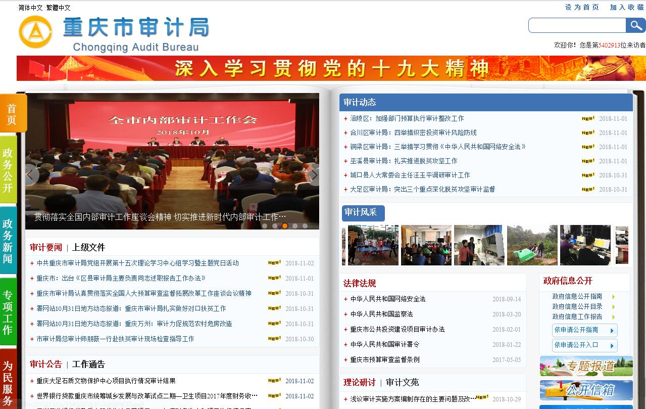 重庆市审计局成立于1983年9月,是经市机构编制委员会办公室审核、市机构编制委员会审定、市人民政府批准,主管全市审计工作的市政府组成部门。根据《中华人民共和国宪法》和《中华人民共和国审计法》规定,实行双重领导体制,对市人民政府和审计署负责并报告工作,审计业务以审计署领导为主。审计管辖范围为本级人民政府各部门、下级人民政府及其各部门、市属国有金融机构和企、事业组织,以及其他按照《中华人民共和国审计法》规定应当接受审计的事项。重庆市审计局内设23个职能处(室):办公室、综合处(审计整改督查处)、法规处、重庆市经济责任审计工作联席会议办公室、经济责任审计处、财政审计处、金融审计处、固定资产投资审计处、行政事业审计处、经贸审计处、农业审计处、社会保障审计处、外资运用审计处、工业审计处、市政建设审计处、教科文审计处、商贸审计处、资源环保审计处、交通审计处、内部审计管理处、计算机应用管理处、财务处、人事处;另设机关党委和离退休人员工作处;1个下属事业单位:重庆市审计中心。主要职责是:(一)主管全市审计工作。负责对国家财政收支和法律法规规定属于审计监督范围的财务收支的真实、合法和效益进行审计监督,维护国家财政经济秩序。对审计、专项审计调查和核查社会审计组织相关审计报告的结果承担责任,并负有督促被审计单位整改的责任。(二)贯彻执行审计法律、法规、规章和方针政策;起草审计地方性法规、规章,制定审计工作规章制度并监督执行。(三)向市政府提交同级预算执行情况的审计结果报告;受市政府委托向市人大常委会提出同级预算执行情况和其他财政收支审计工作报告。(四)对本级预算执行情况、本级各部门(含直属单位)预算执行情况、决算及预算外资金的管理和使用情况进行审计监督;对下级政府预算执行情况、决算及预算外资金的管理和使用情况进行审计监督。(五)组织、指导、协调全市经济责任审计工作;按规定对市管领导干部及依法属于市审计局审计监督对象的其他单位主要负责人进行经济责任审计。(六)按审计法规定和审计署、市政府授权,对国有金融机构和地方金融组织的资产、负债、损益进行审计监督;按审计署授权和市政府交办,对国际金融组织和外国政府援助、贷款项目的财务收支进行审计监督。(七)对使用财政资金的市属事业单位和社会团体的财务收支,以及市级重点建设项目和国家投资的其他固定资产投资项目预算执行情况和决算进行审计监督。(八)对市属国有企业、国有资产占控股地位或者主导地位的企业和审计署授权的中央在渝企业的资产、负债、损益进行审计监督;配合和参与审计署安排的有关审计项目。(九)对市政府有关部门管理的和社会团体受市政府委托管理的社会保障基金、环境保护资金、社会捐赠资金以及其他有关基金、资金的财务收支进行审计监督。(十)按审计署授权对移民资金等中央专项资金行审计监督。(十一)对法律法规规定应当由审计机关审计的其他事项进行审计监督;对与国家财政收支有关的特定事项,对地方、部门、单位进行专项审计调查。(十二)依法检查审计决定执行情况,督促纠正和处理审计发现的问题,依法办理被审计单位对审计决定提请行政复议、行政诉讼或市政府裁决中的有关事项。协助配合有关部门查处相关重大案件。(十三)指导和监督内部审计工作,核查社会审计组织对依法属于审计监督对象的单位出具的相关审计报告。(十四)组织全市审计科学研究和学术交流;组织指导和推广信息技术在审计领域的应用,组织建设全市审计信息系统。(十五)与区县(自治县)人民政府共同领导区县(自治县)审计机关;依法领导和监督地方审计机关的业务,组织区县(自治县)审计机关实施特定项目的专项审计或审计调查,纠正或责成纠正区县(自治县)审计机关违反国家规定做出的审计决定;按照干部管理权限协管区县(自治县)审计机关负责人。(十六)承办市政府交办的其他事项。