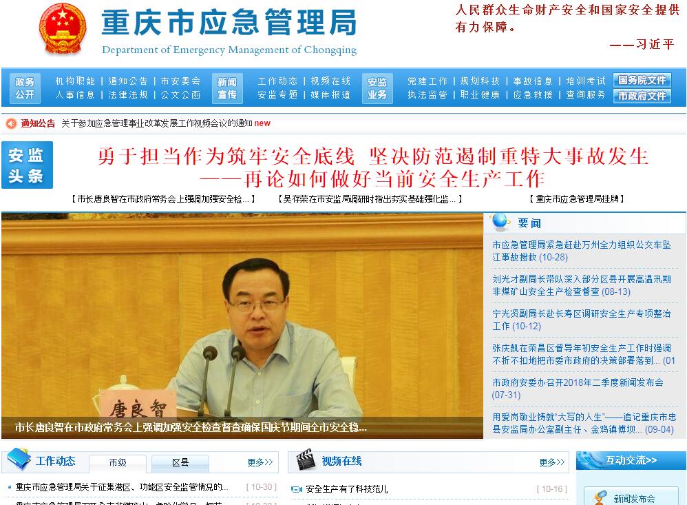 | 网站简介: 重庆市应急管理局,是重庆市机构改革新组建的单位,是重庆市人民政府组成部门。重庆市应急管理局,将原重庆市安全生产监督管理局的职责,以及市政府办公厅的应急管理职责,市公安局的消防管理职责,市民政局的救灾职责,市煤炭工业管理局的煤矿安全监管职责,市国土资源和房屋管理局的地质灾害防治、市水利局的水旱灾害防治、市农业委员会的草原防火、市林业局的森林防火相关职责,市自然灾害应急指挥部的职责,市防汛抗旱指挥部、市地质灾害抢险救援指挥部、市抗震救灾指挥部、市森林防火指挥部的职责等整合,组建的,作为市政府组成部门,按中央有关改革部署实施。市政府安全生产委员会的日常工作由市应急管理局承担。 |