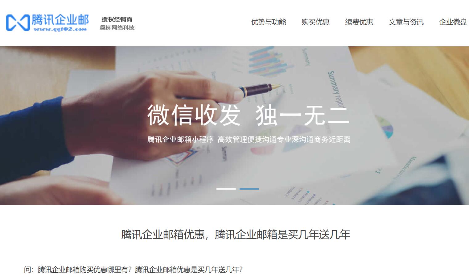 | 网站简介: 新购买腾讯企业邮箱优惠哪里有?腾讯企业邮箱的优惠促销活动是买几年送几年?截止本条消息发布时,通过腾讯官方授权企业邮箱服务商桑桥网络( www.sangqiao.com )购买可以享受“买3年送2年、买2年送1年”优惠。这是服务商渠道的限时促销活动,走过路过不要错过,促销期结束后恢复原价。只有通过服务商渠道才能享受此项优惠,在官网在线直购不能享受此优惠。通过腾讯企业邮箱服务商桑桥网络购买升级企业微信邮件高级功能的流程是:确认意向—签订合同、客户打款—邮箱开通—开发票 、服务支持。优惠促销活动随时可能结束,具体情况请以咨询客服人员的答复为准。购买腾讯企业邮箱( www.qqmail.biz ),这是最低价的腾讯企业邮箱价格了。通过我们升级邮件高级功能10分钟生效,10分钟后你就可以在自己的企业邮箱管理员后台看到新购买后的到期日期,靠谱无忧。 |